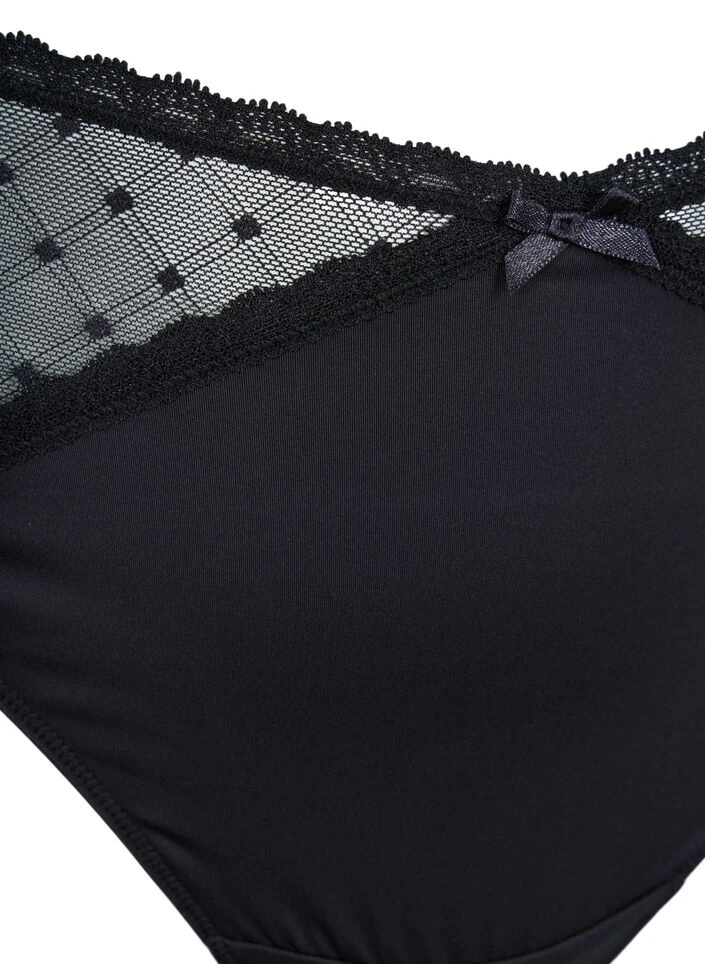 Pretty thong in a feminine design with regular waist height. It has beautiful patterned mesh details and a small fine bow on the front.
