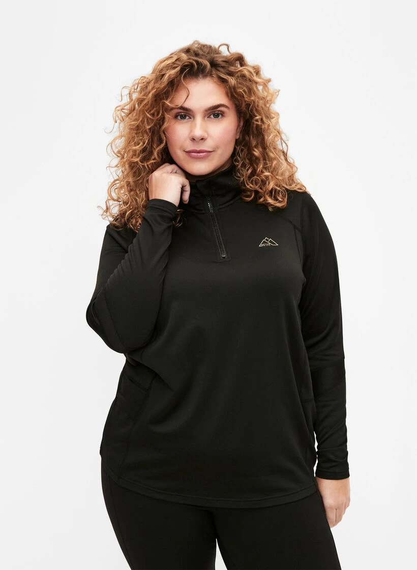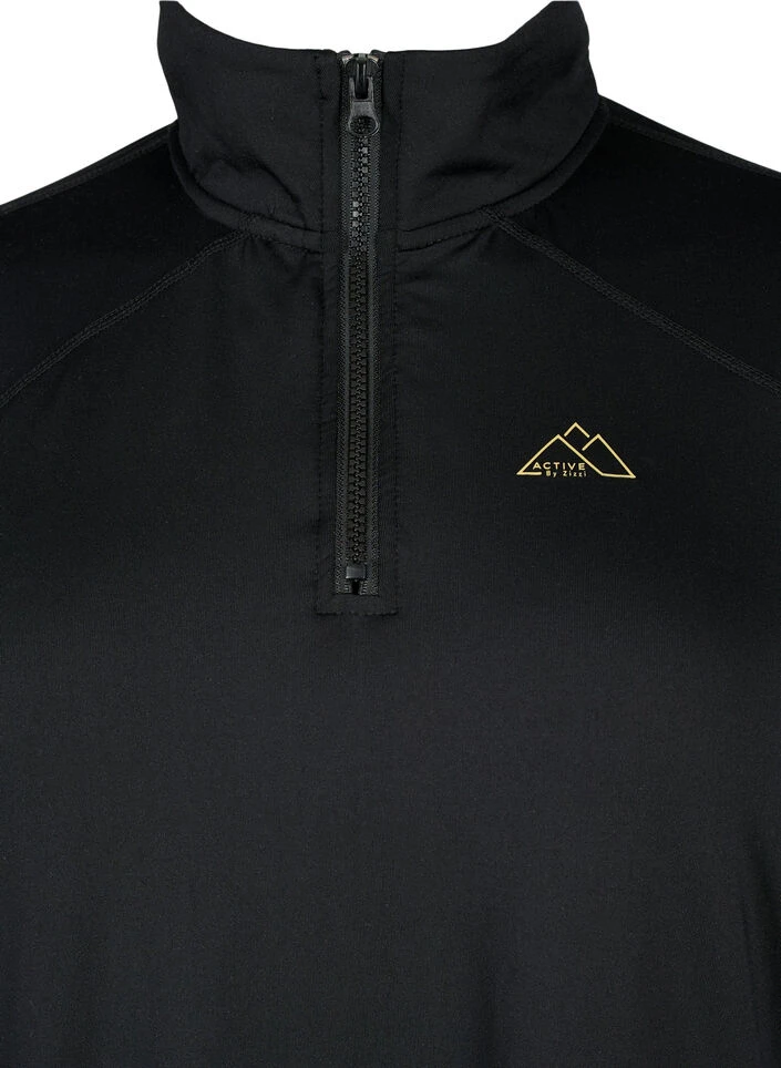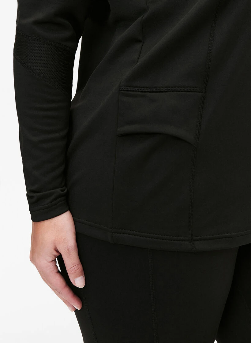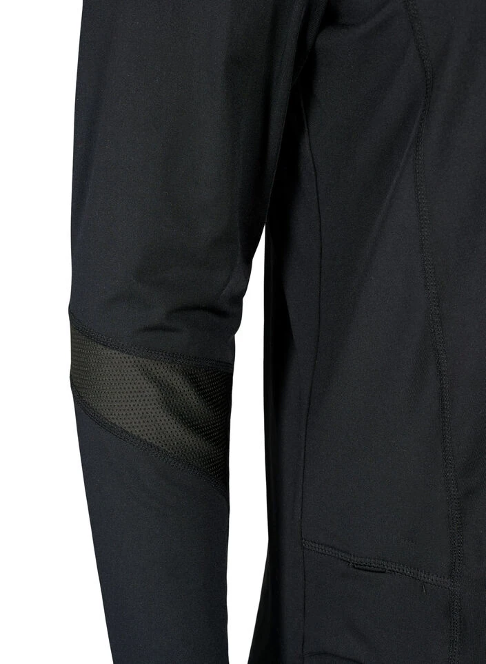 Comfortable baselayer blouse with a high neck and short zipper, featuring a practical pocket-in-pocket design equipped with a discreet opening for headphones. The blouse is made of a sweat-wicking and breathable material, providing a soft feel against the skin and keeping you dry during physical activity. Mesh detail on the sleeves ensures good ventilation.