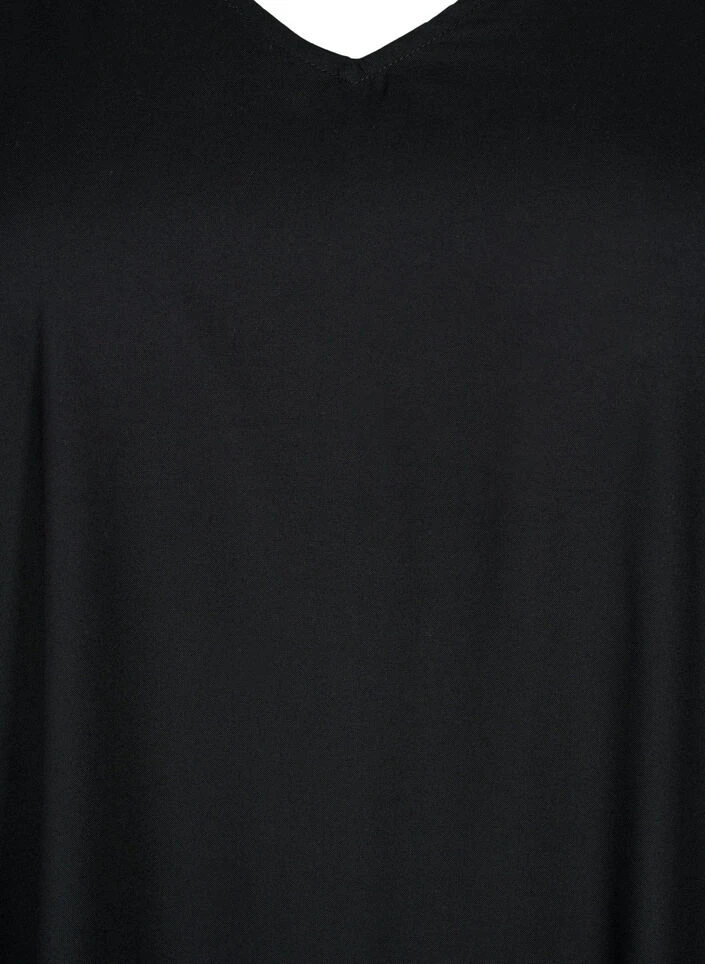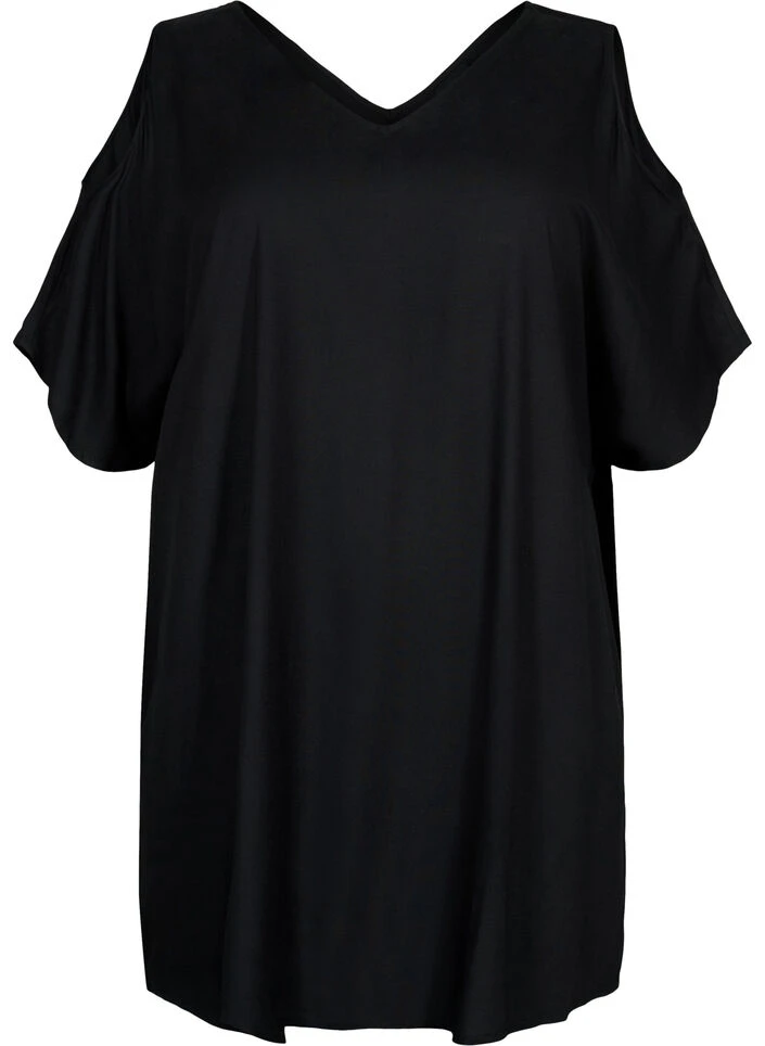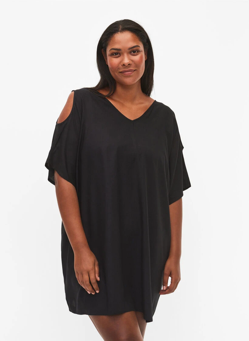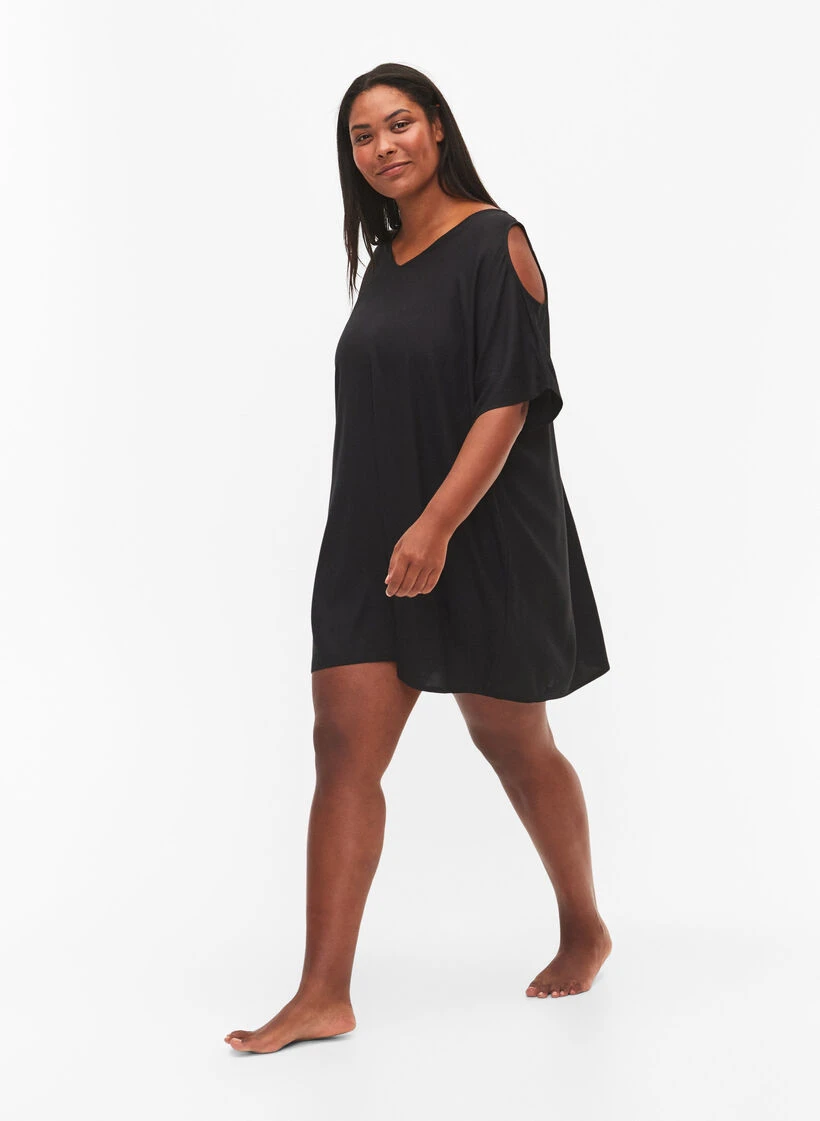 Beautiful beach dress in 100% viscose with loose fit. The dress has short sleeves with cut-out part on the shoulders and deep v-neckline on the back and front.