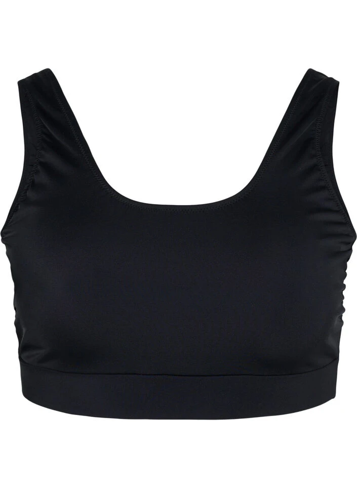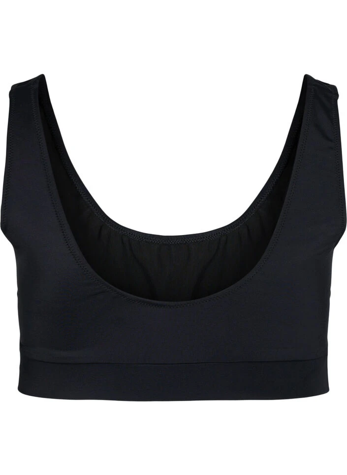 Stylish bikini top with a round neckline on both the front and back, wide elastic panel under the bust and wide straps. The top is sewn in a 2-layered fabric that wraps beautifully around your curves and provides good comfort and support. The fabric is durable and fast-drying.