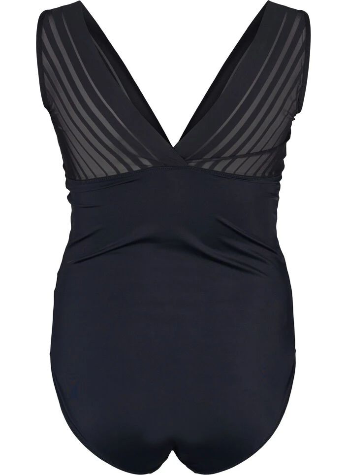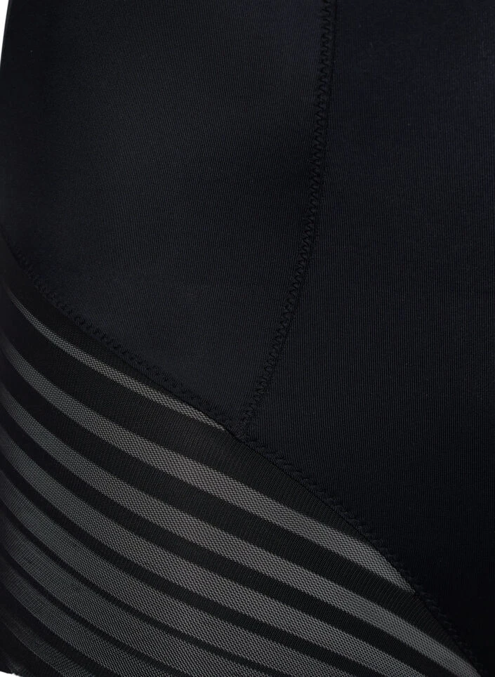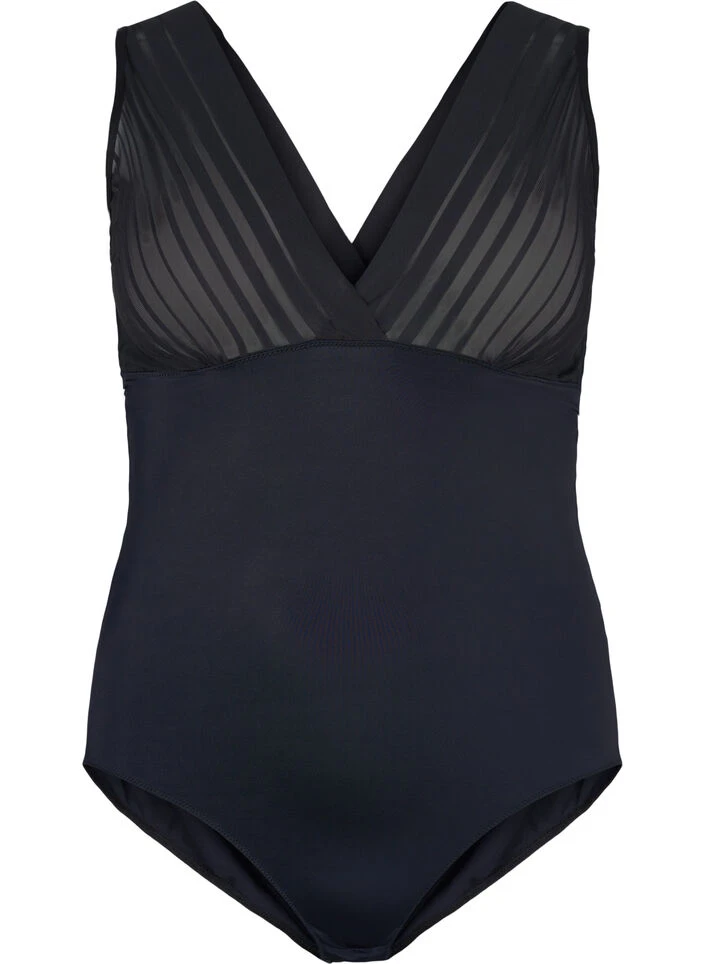 Close-fitting body suit with deep v-neckline and nice striped mesh piece at the top. It closes with press studs at the bottom.