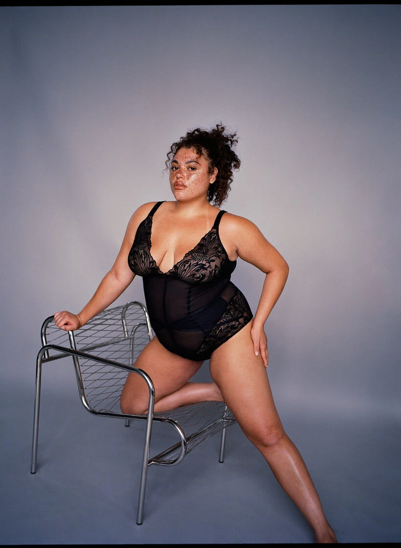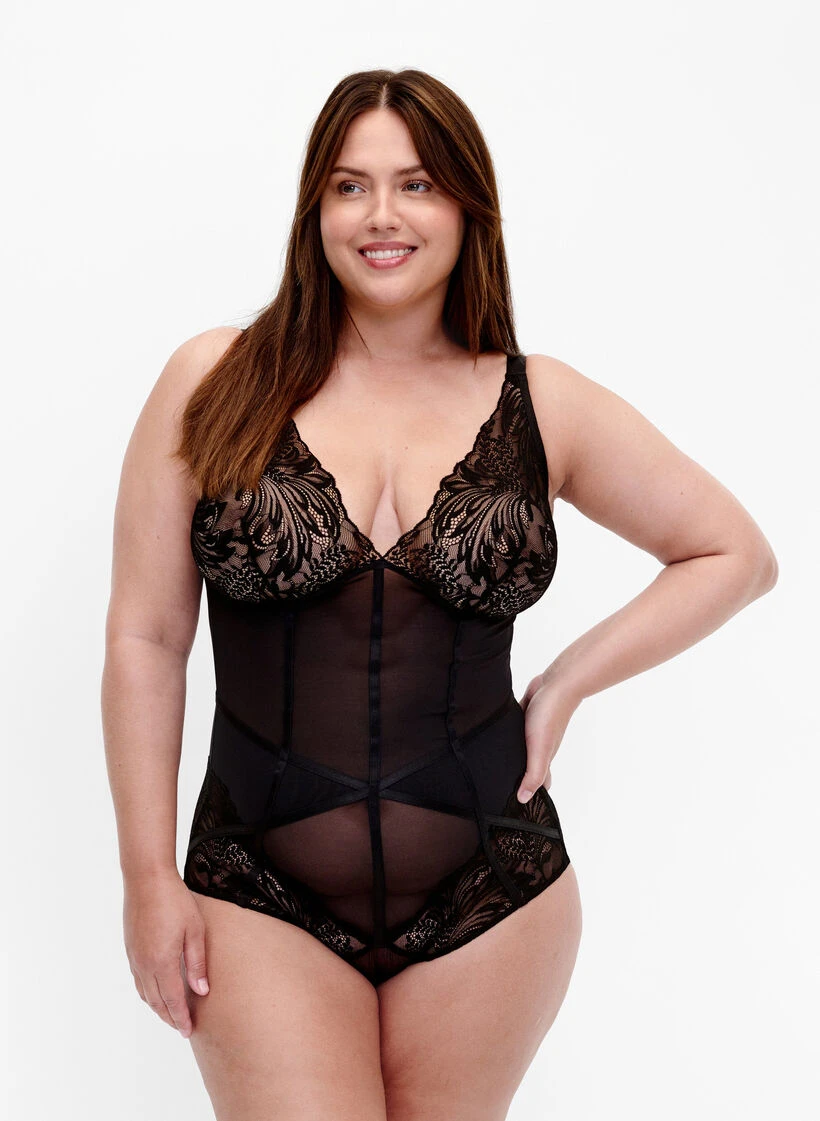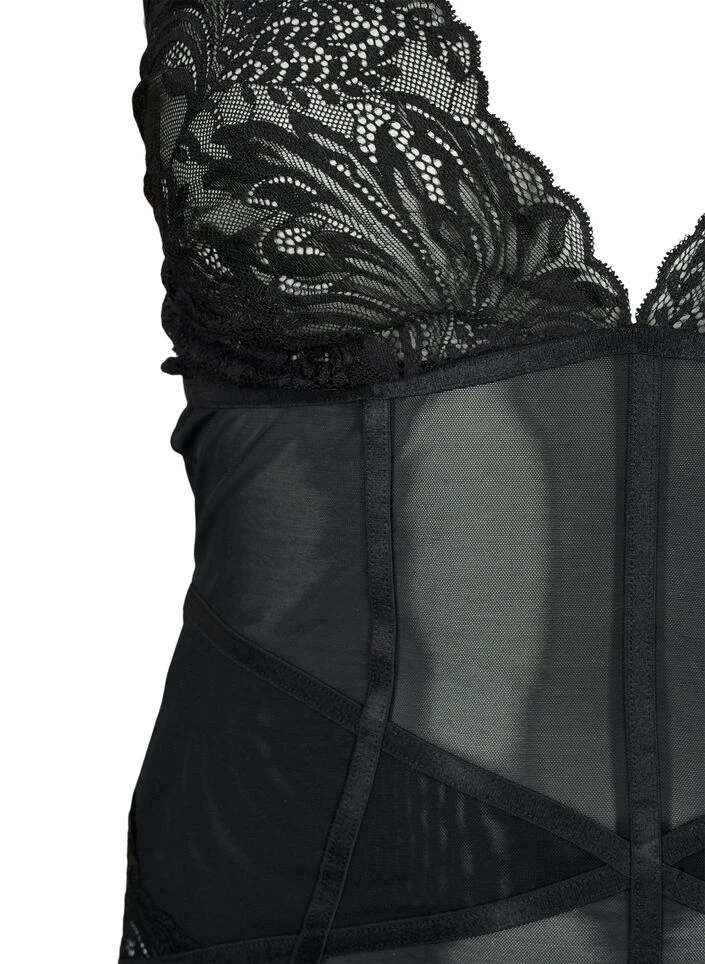 Beautiful bodystocking with mesh and feminine lace. The body stocking has a deep v-neckline, adjustable shoulder straps and hidden press studs in the gusset.
