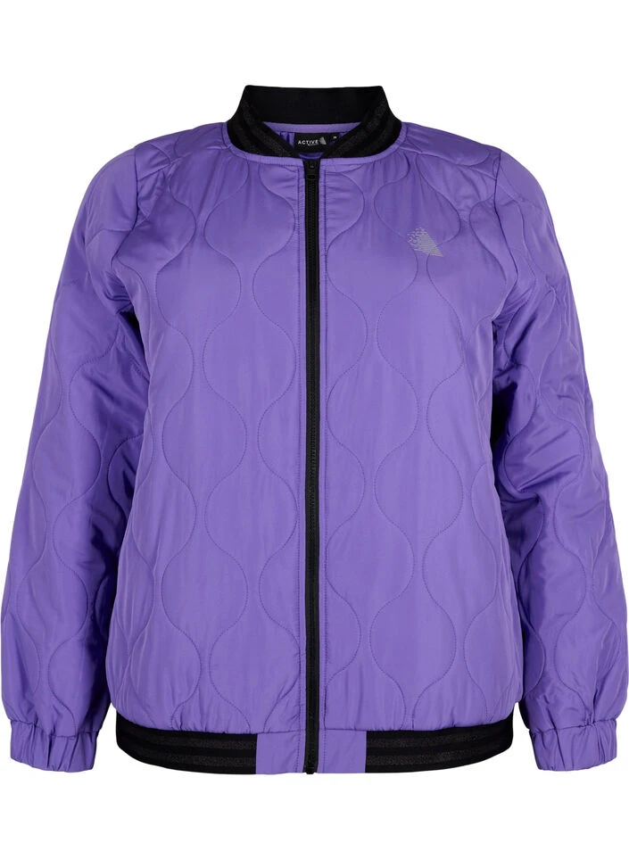Short sporty bomber jacket with feminine elastic glitter bands at bottom and neckline. The jacket has a loose fit with pockets at the side, elasticated cuffs and closes with a zip at the front.