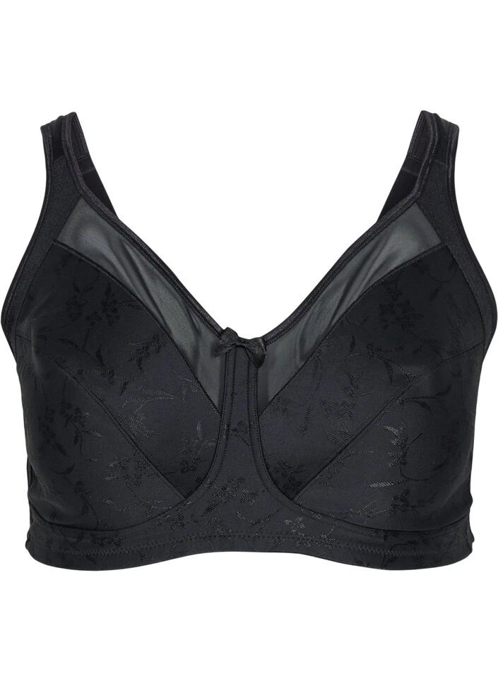 Bra with a feminine tone-on-tone pattern and mesh at the edge of the cups. The bra is non-wired and non-padded and has wide, padded shoulder straps.