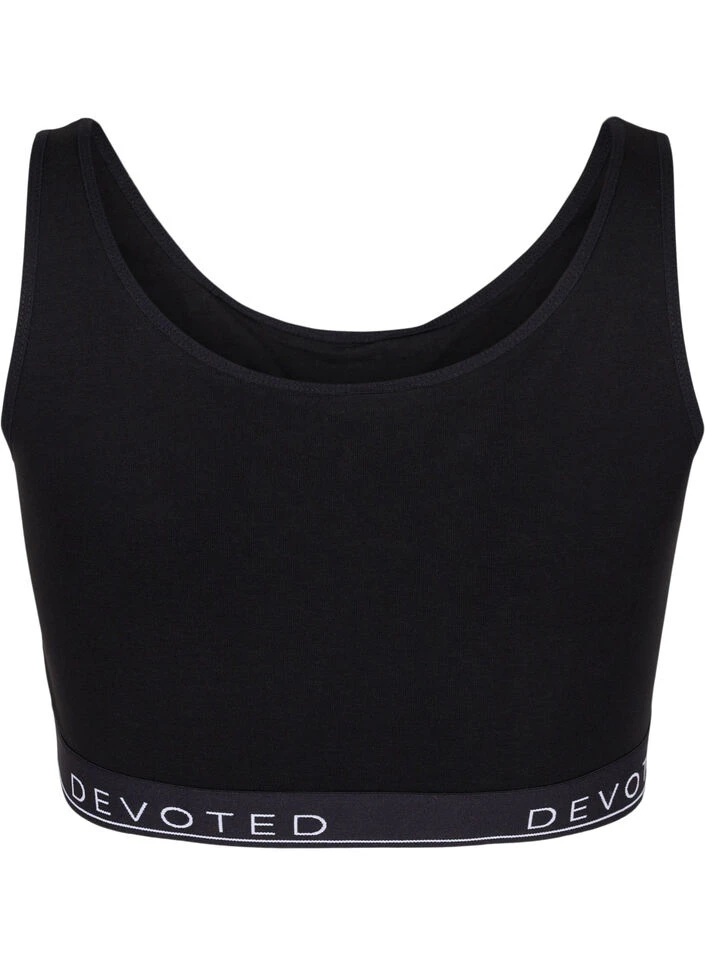 V-neck bra with text print and elastic under the bust. The bra has no padding and is made from a soft and comfortable cotton quality.