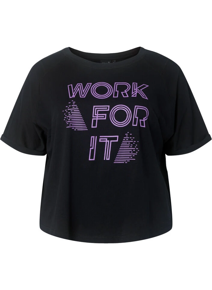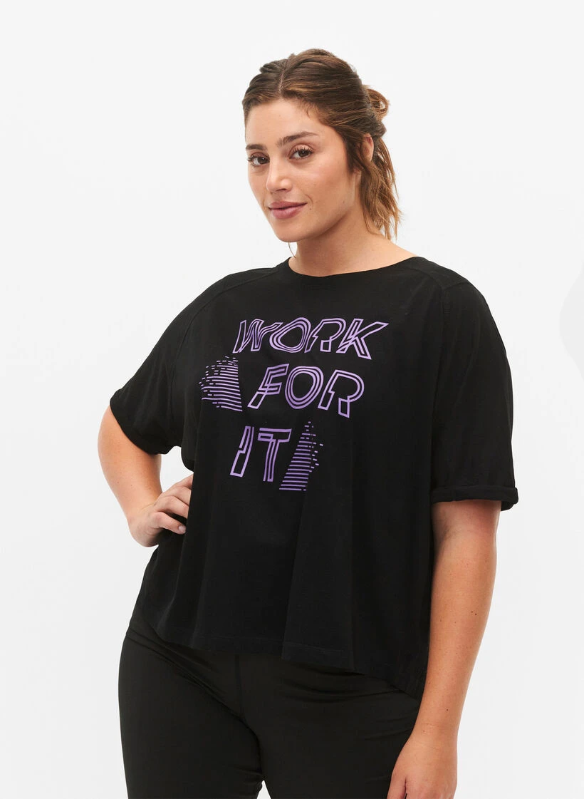 Short workout t-shirt in a soft cotton blend with 50% organic cotton and a print on the chest. The t-shirt has short batwing sleeves and a loose fit.