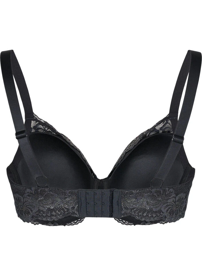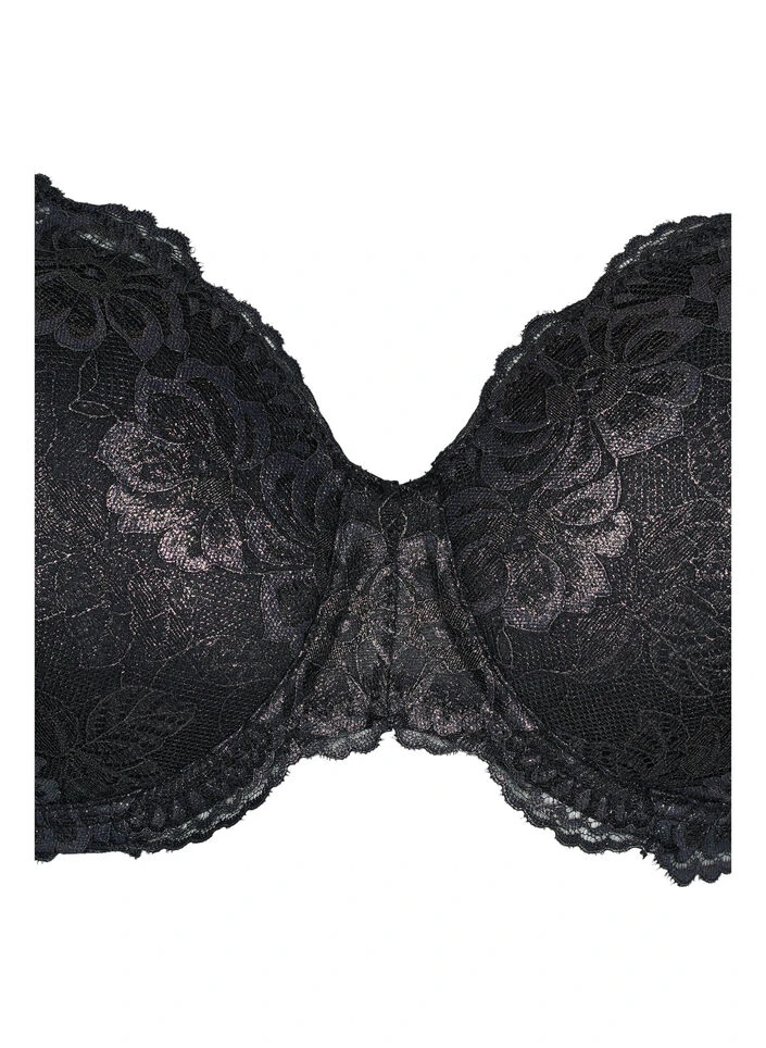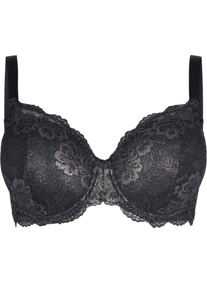 Feminine lace bra with wide adjustable shoulder straps. The bra has underwires and moulded padded cups with good support.
