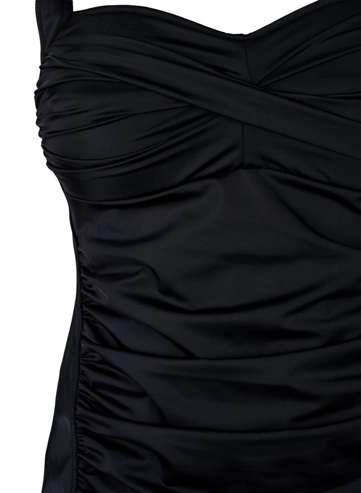 Beautiful and classic tankini with adjustable straps and draping on the front for a feminine look.
