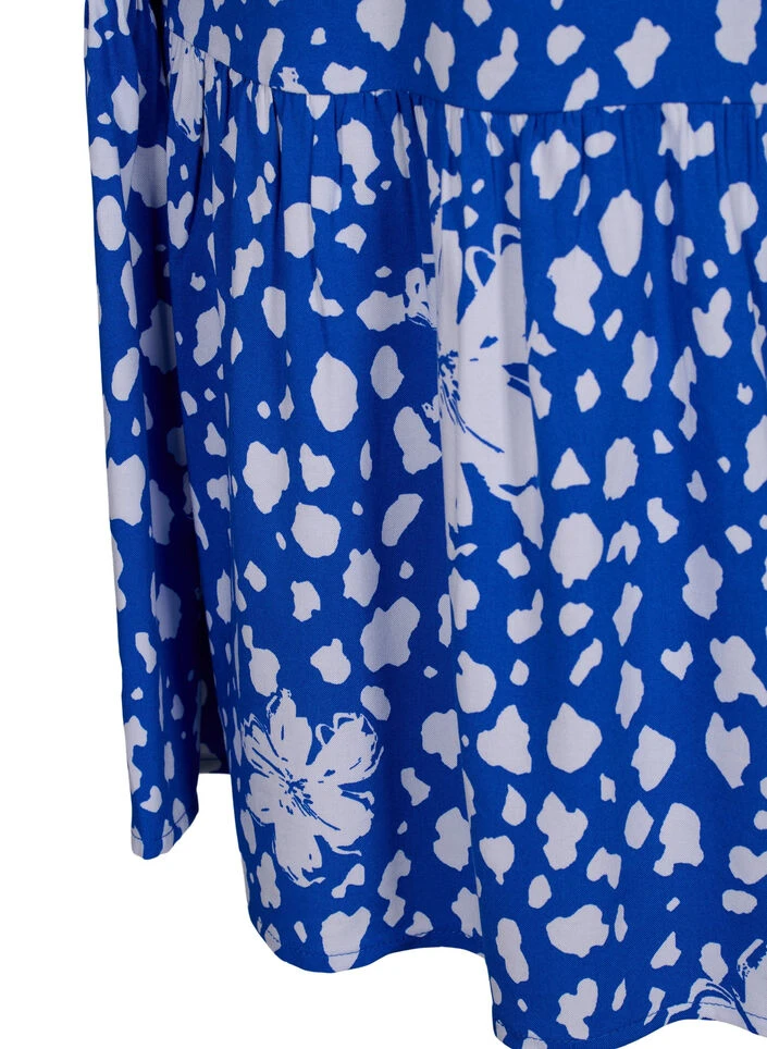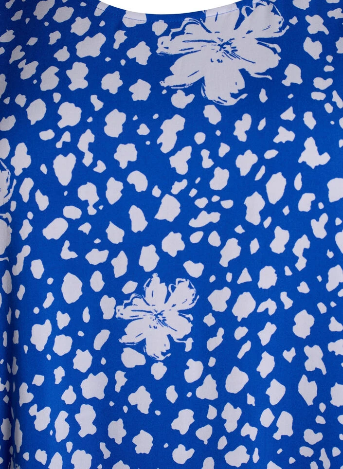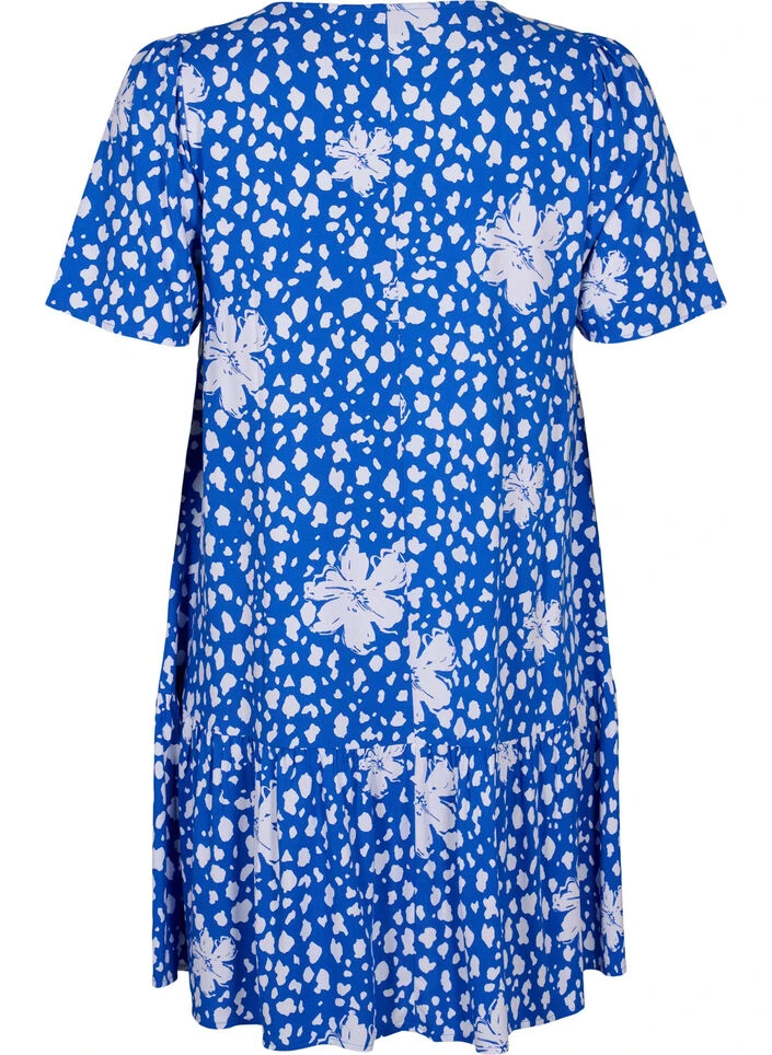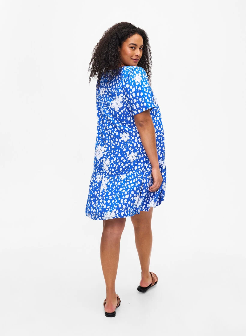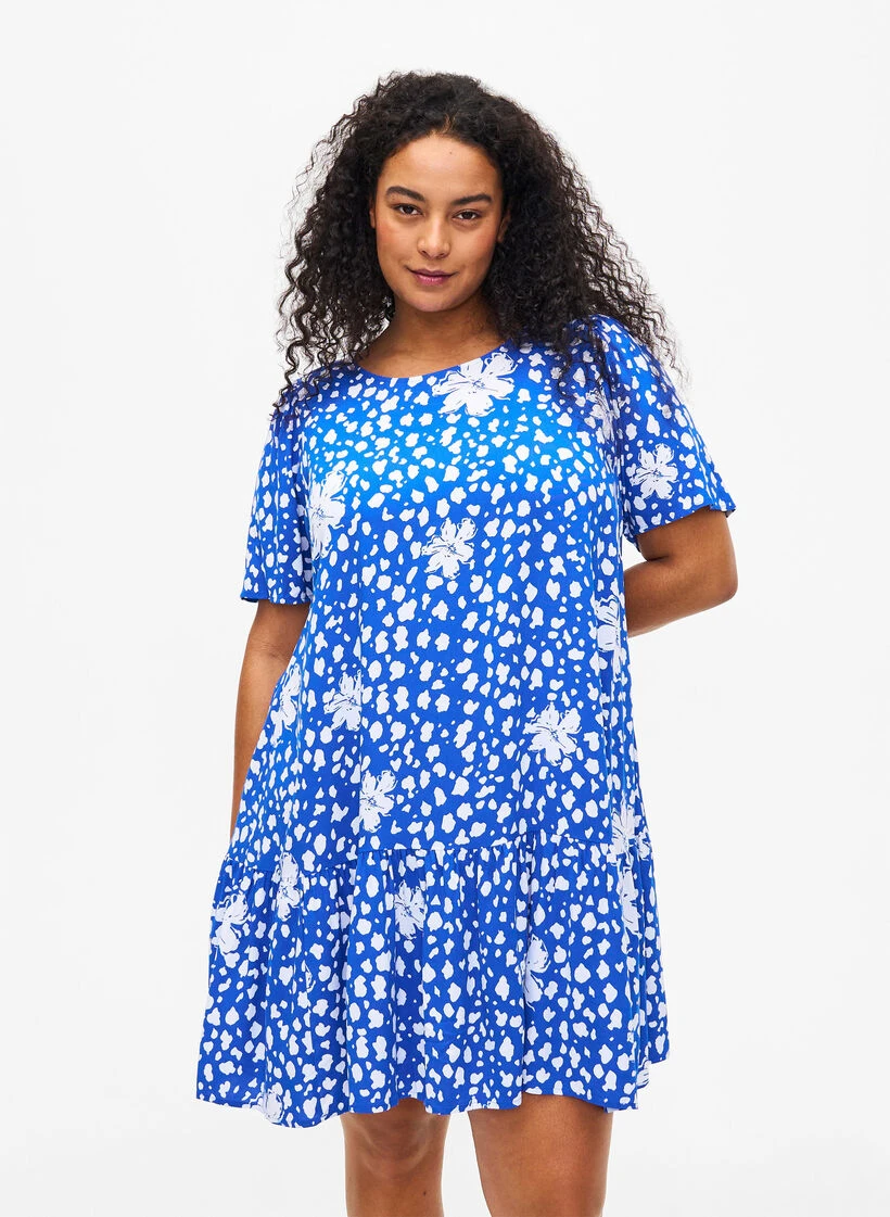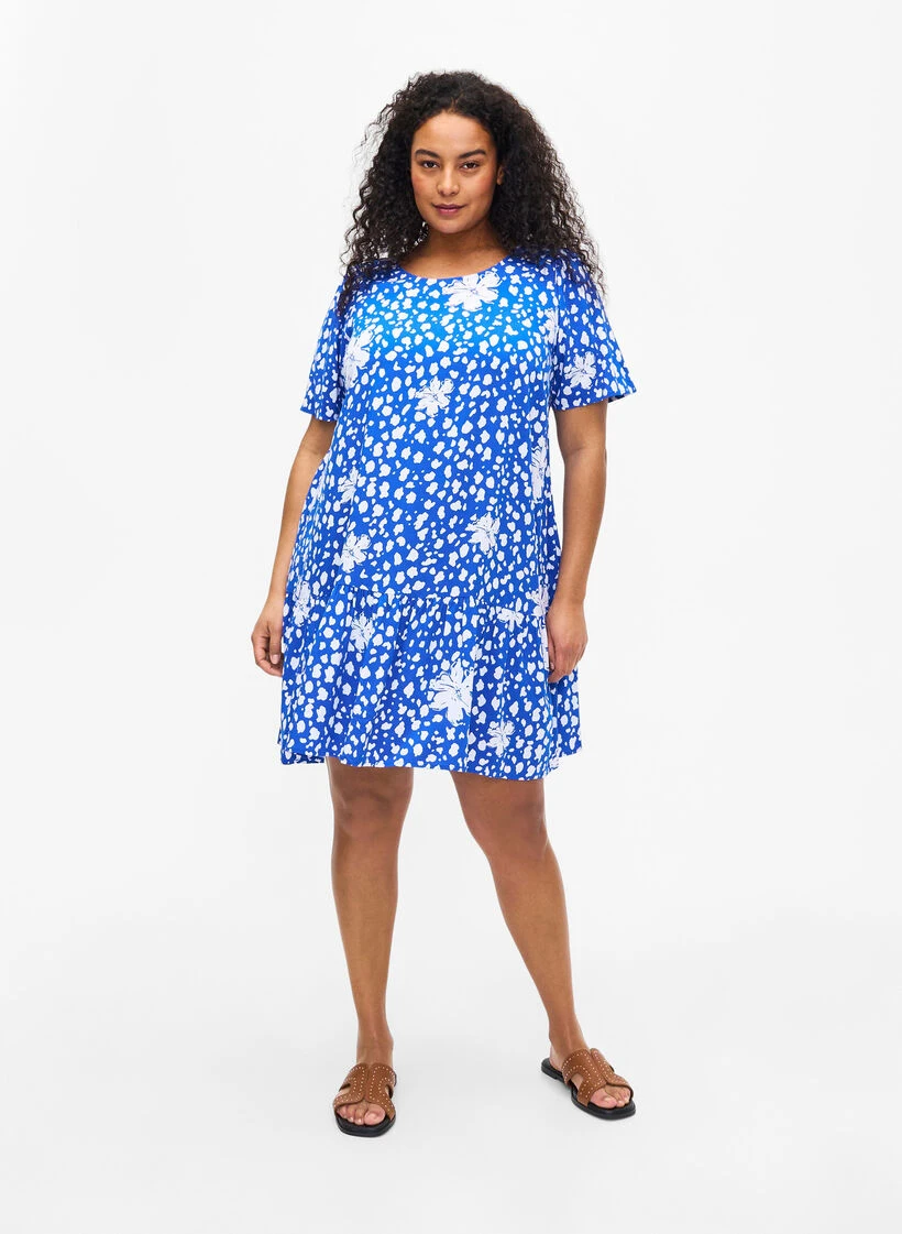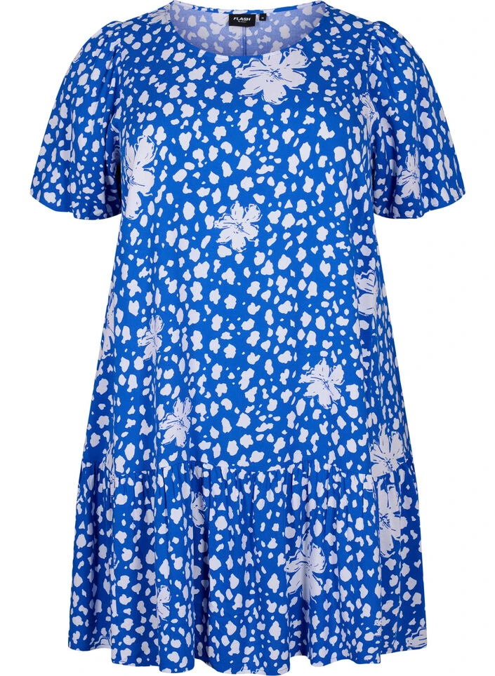 Loose fitting dress with a cutline at the bottom, creating a beautiful A-line silhouette. The dress has short sleeves with gathered shoulder detail, round neck, and is made of 100% LENZING™ ECOVERO™ viscose.