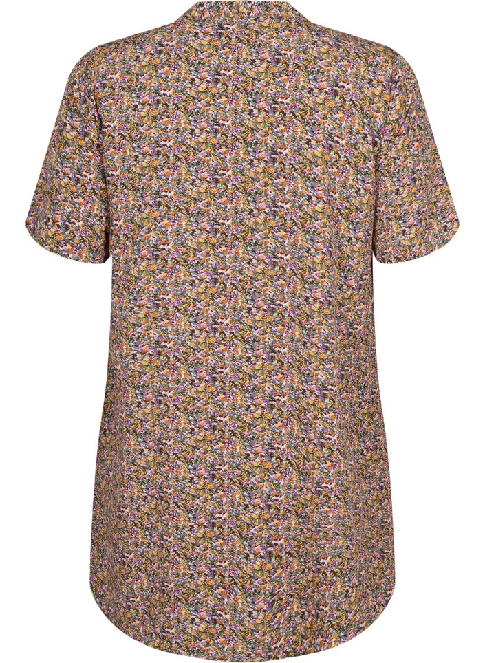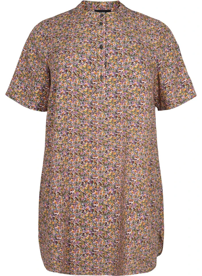 Short sleeved tunic with nice all-over print. It has a round neck with front closure, small slit in the side and a loose fit.