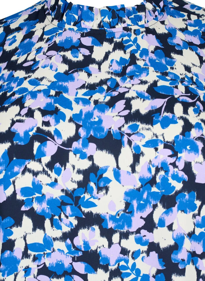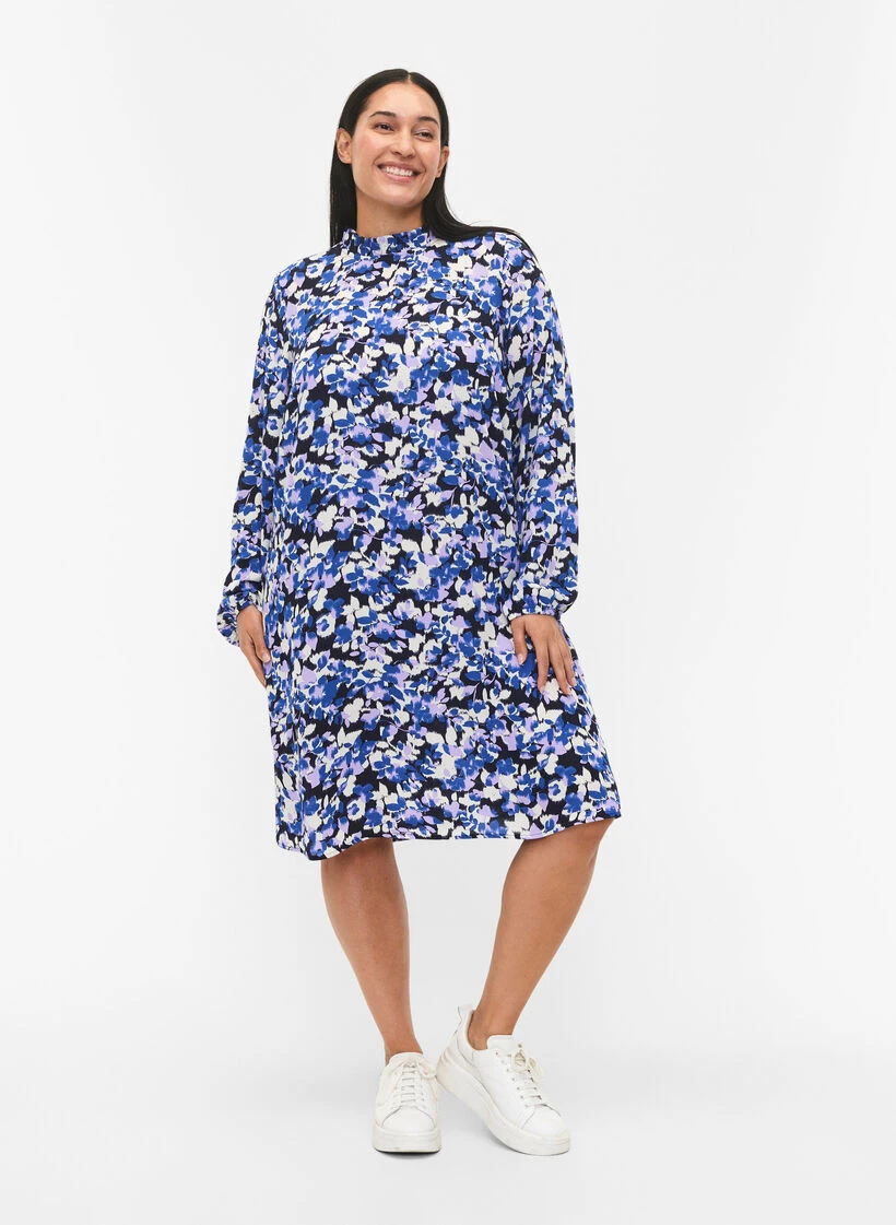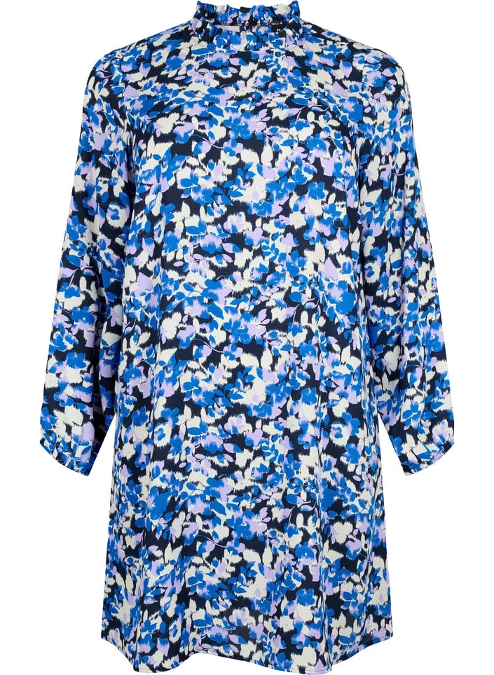 Loose-fitting dress with a beautiful all-over print. The dress has long sleeves with elastic hems and a feminine ruffle collar that fastens with a button at the back.