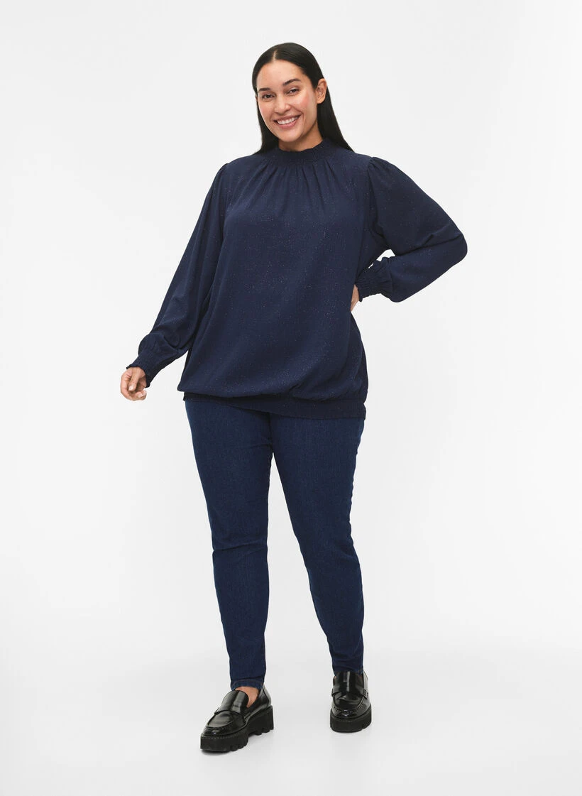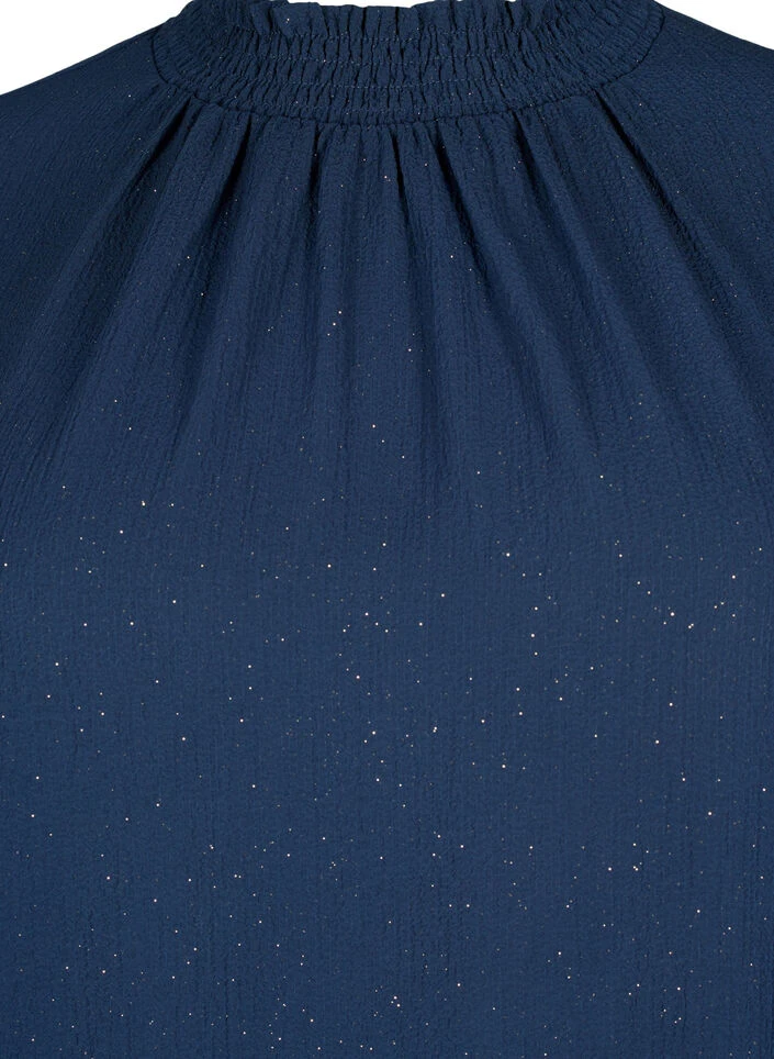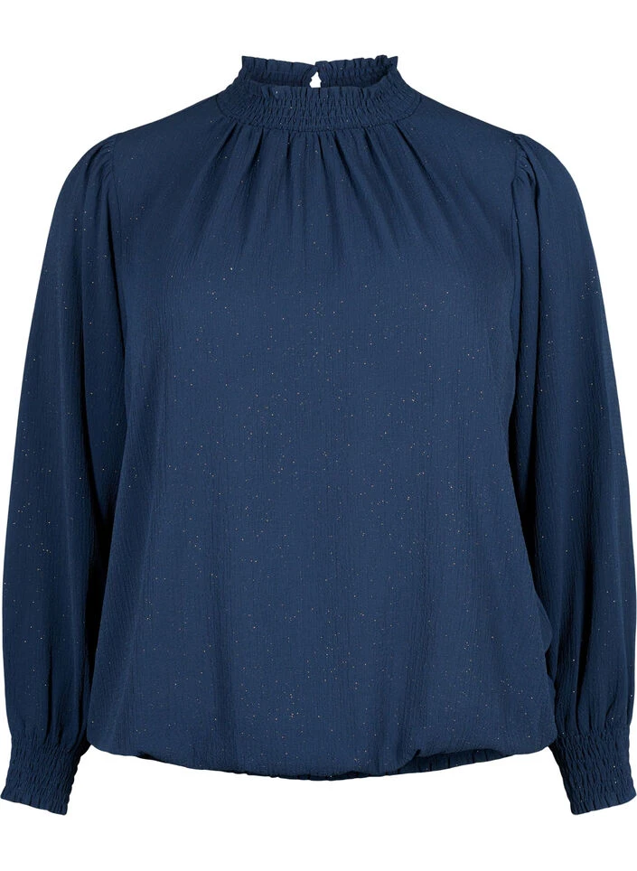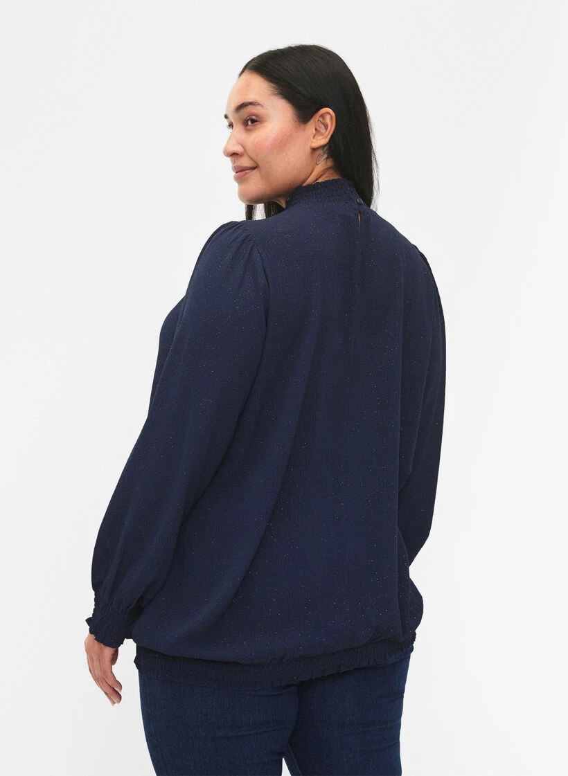 Beautiful blouse with woven glitter thread and button closure at the neck. The blouse has smock on the neckline, sleeves and bottom, which creates a nice balloon effect.