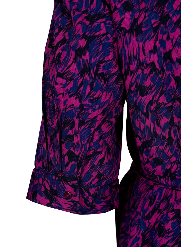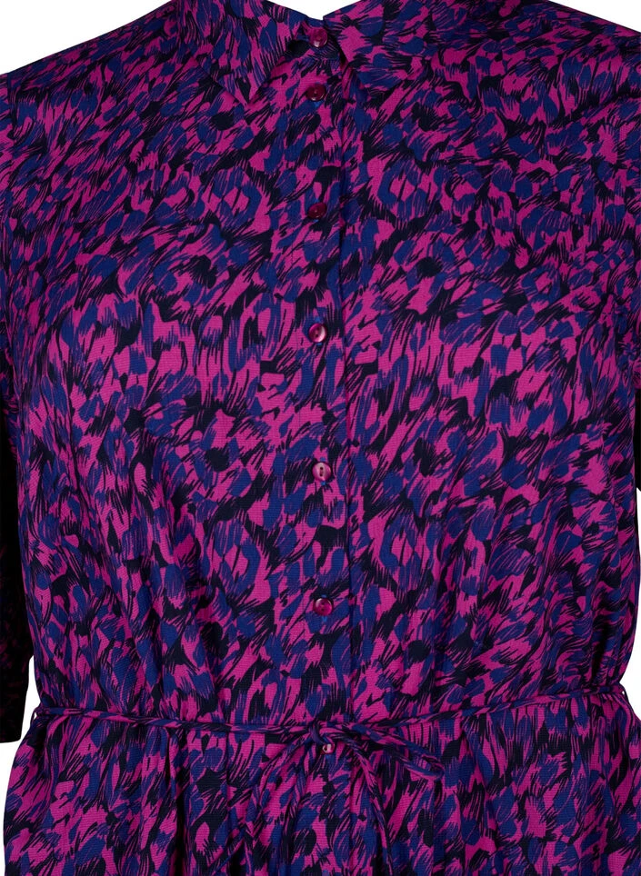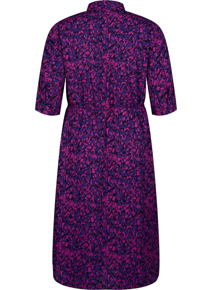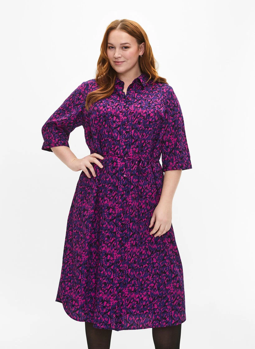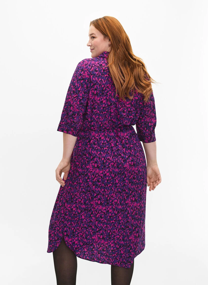 Shirtdress with nice all-over print and midi length. The dress has 3/4 sleeves, full button closure, small slit in the side and fine detachable tie band in the waist, emphasises the feminine silhouette.
