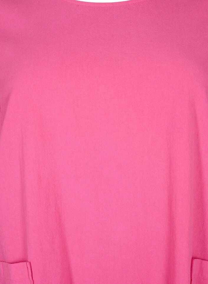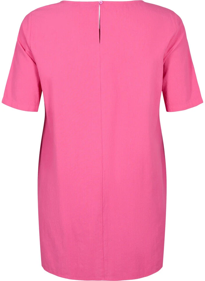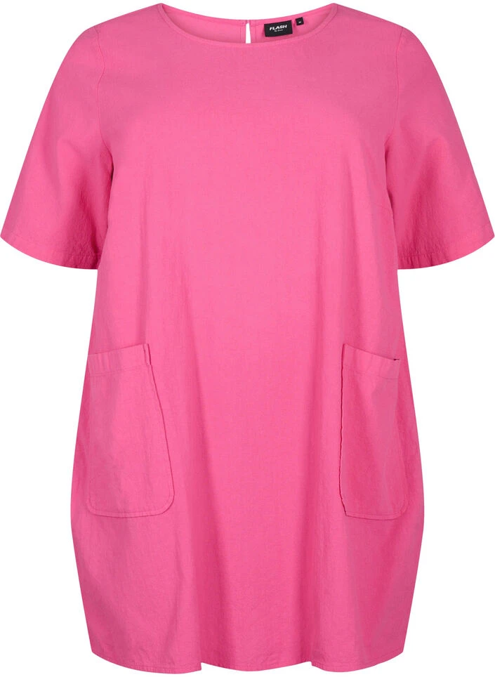 Short sleeve tunic with round neckline and button closure in the neck. It has large pockets on the front and is made in a comfortable quality of 100% cotton.