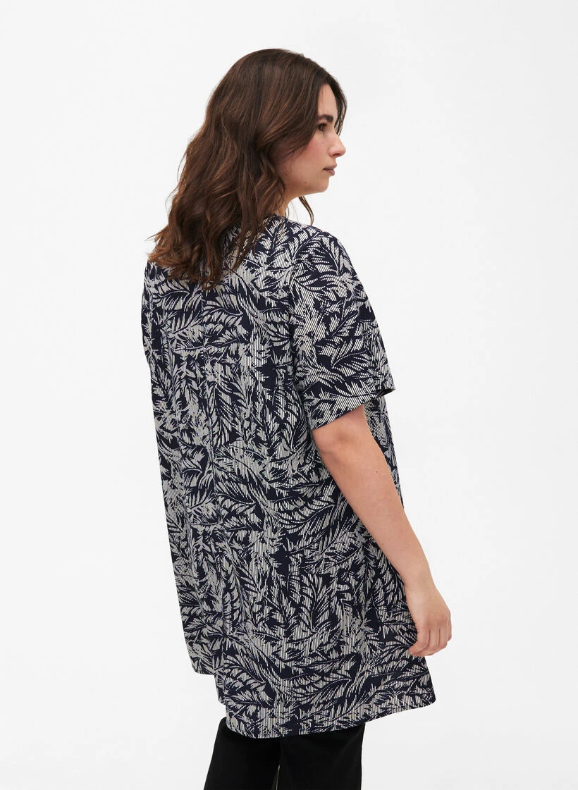 Short-sleeved tunic with v-neckline. The tunic has a loose a-shape and a nice all-over print.