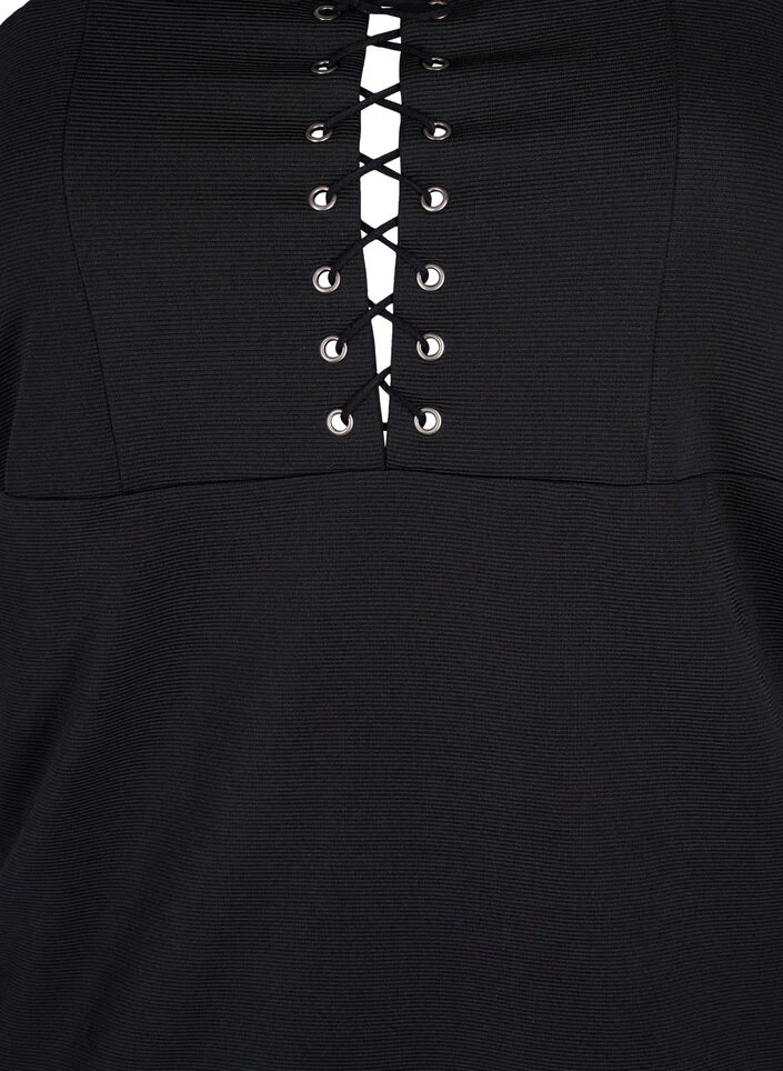 Sleeveless dress with a figure-hugging fit and narrow shoulder straps. The dress has a deep neckline with cords that beautifully accentuate the bust.