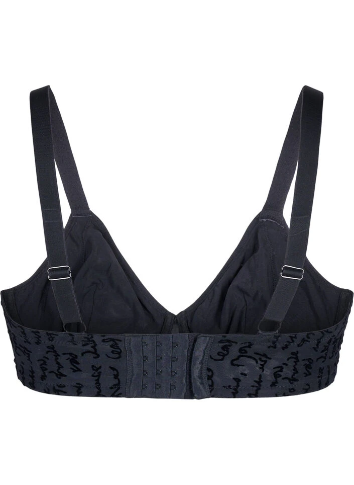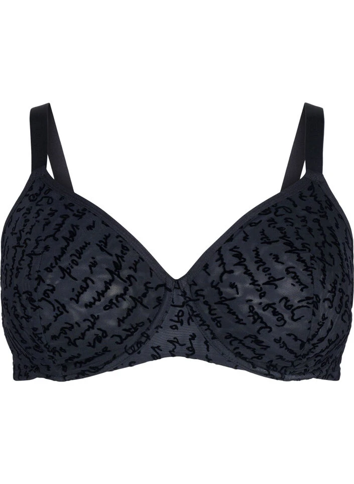 Underwired bra with decorative text print. The bra has adjustable straps, extra width, and high side seams to ensure maximum support.