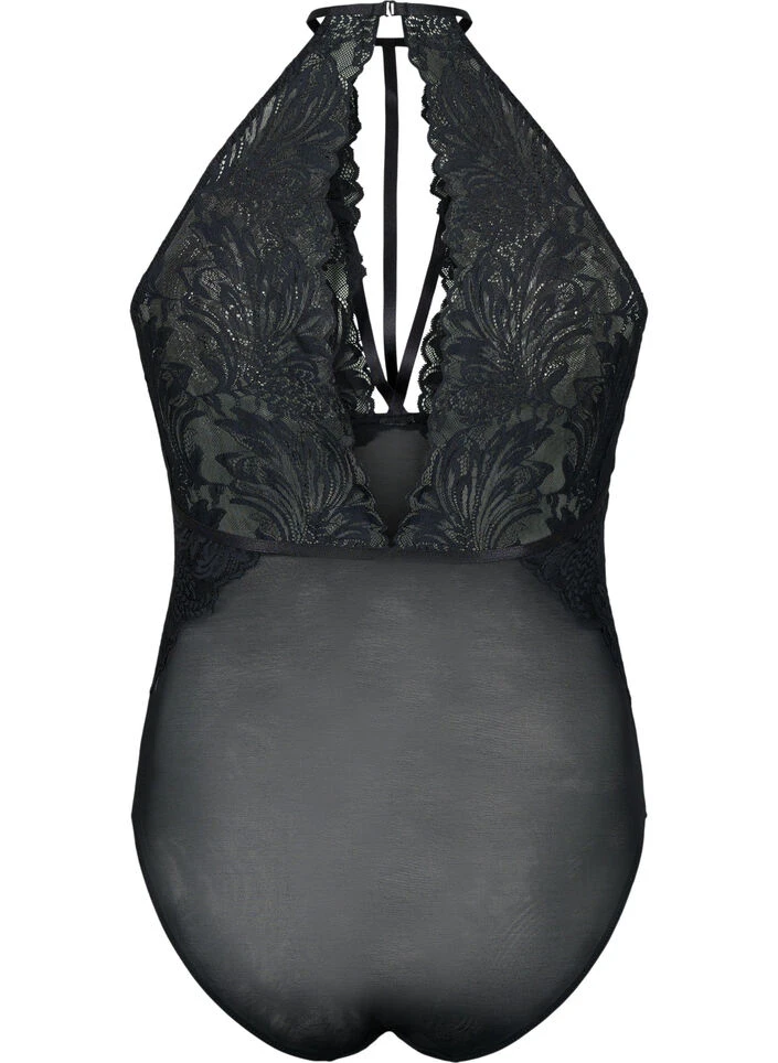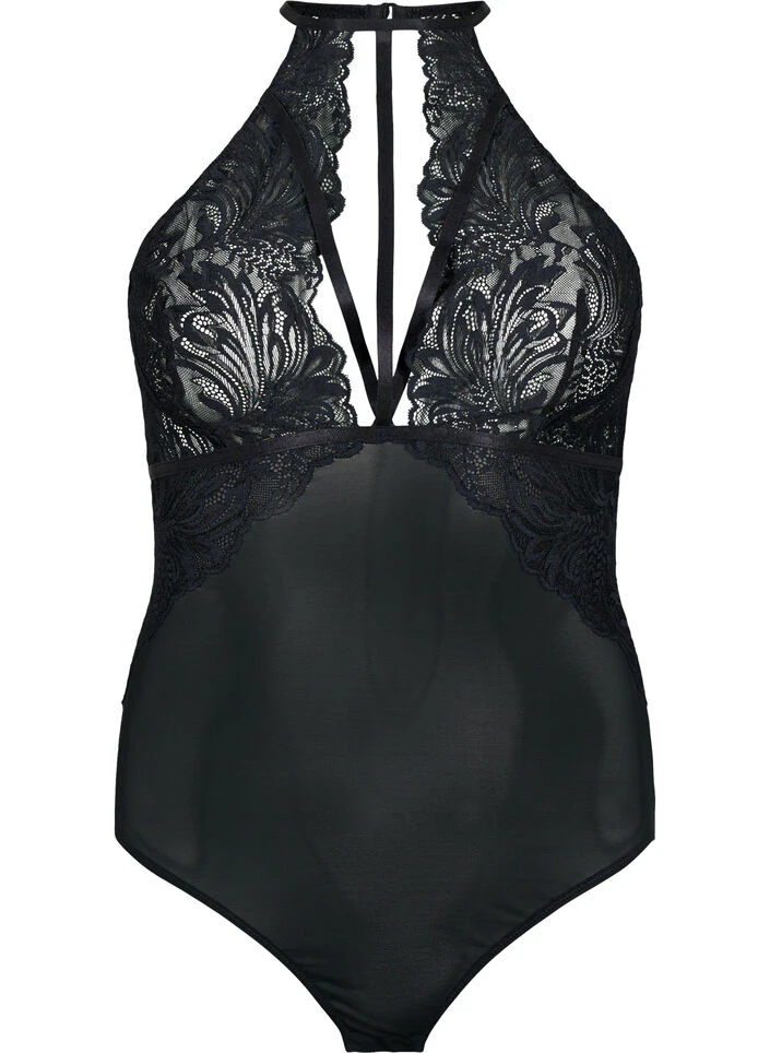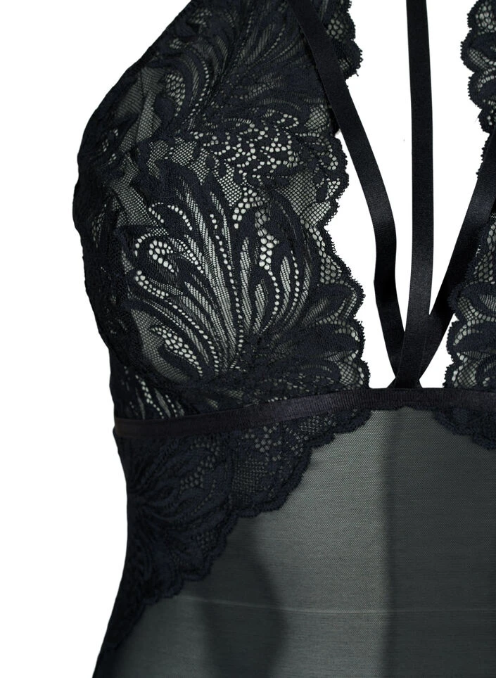 Super feminine bodystocking with a halterneck that closes at the neck. This bodystocking is made in a mesh and lace combination with beautiful cut-outs and string detail at the front and hidden press studs in the gusset.