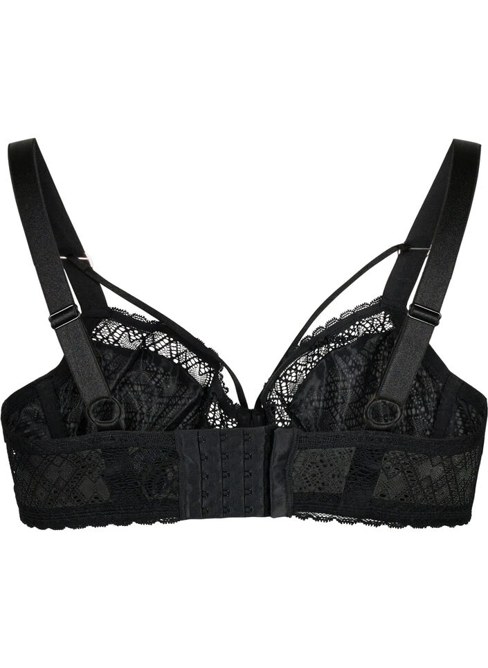 Lace balconette bra with string detail over the chest. It has underwire, adjustable shoulder straps and no padding.