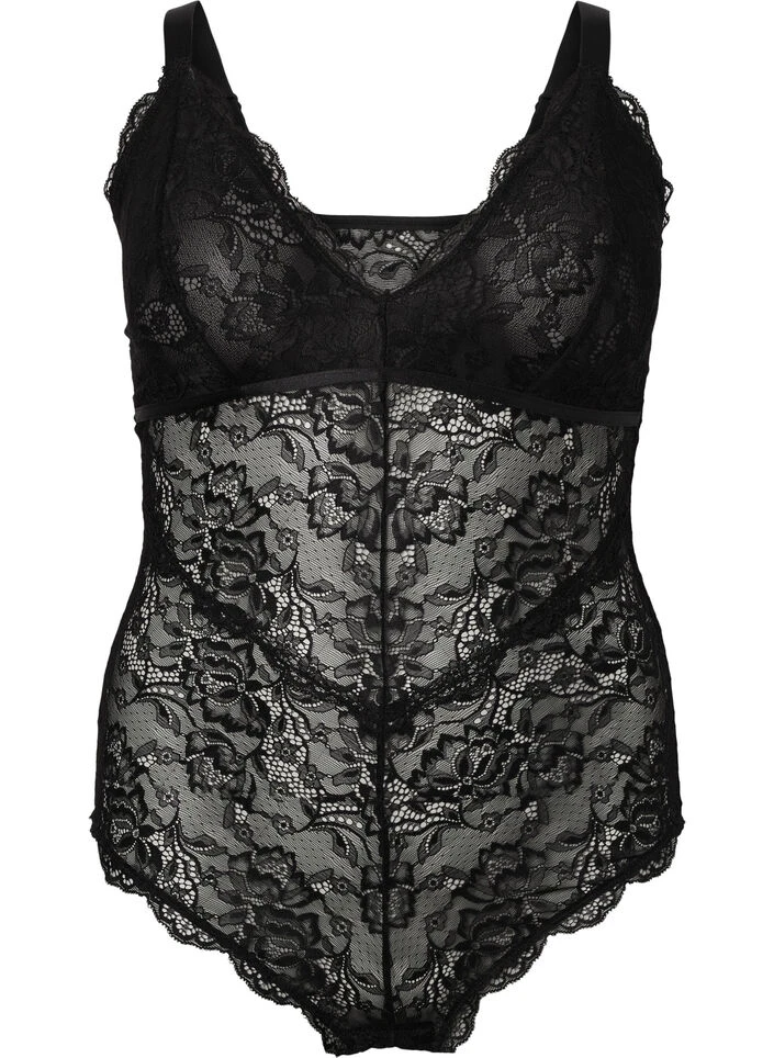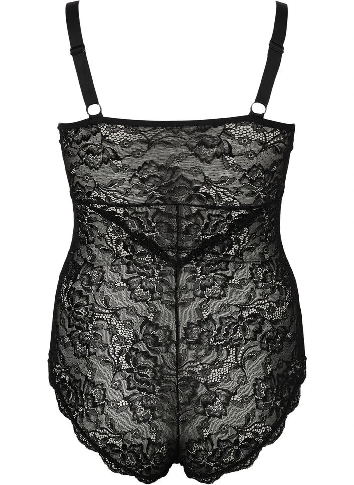 Feminine bodystocking in a beautiful and stretchy lace quality. The bodystocking has a v-neckline and adjustable shoulder straps.