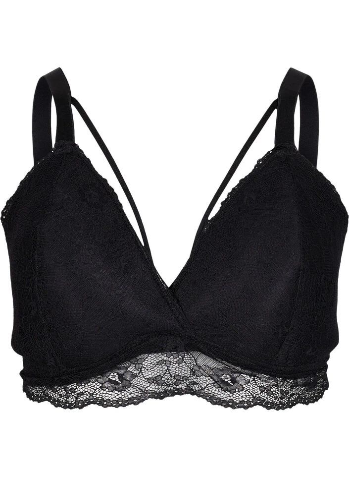 Gorgeous lace bra with decorative string details on the front. The bra has no underwire, light padding and adjustable shoulder straps.