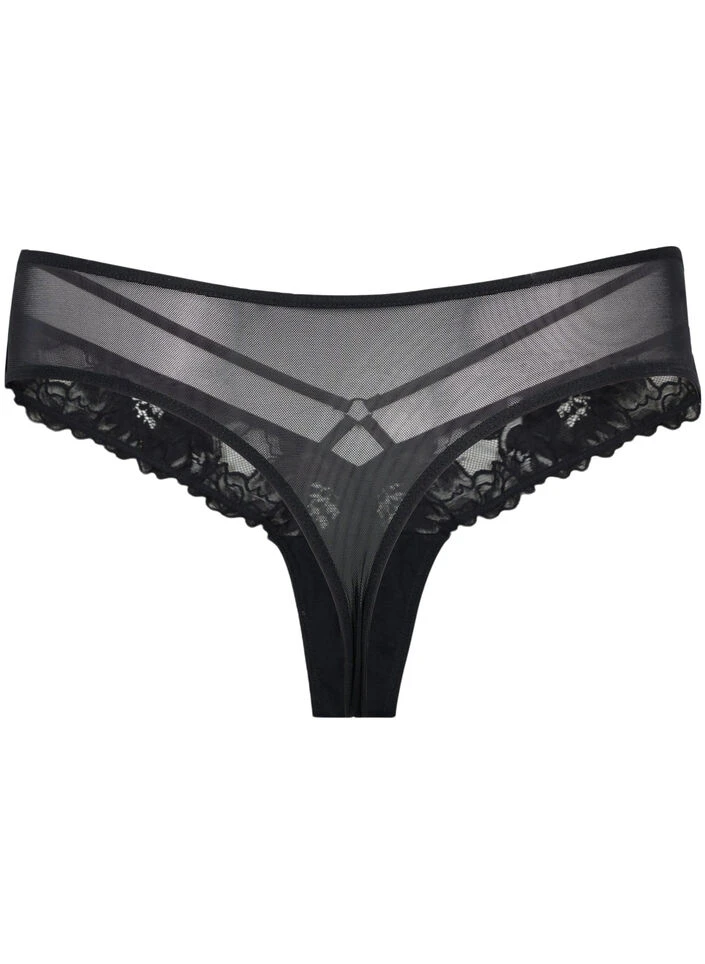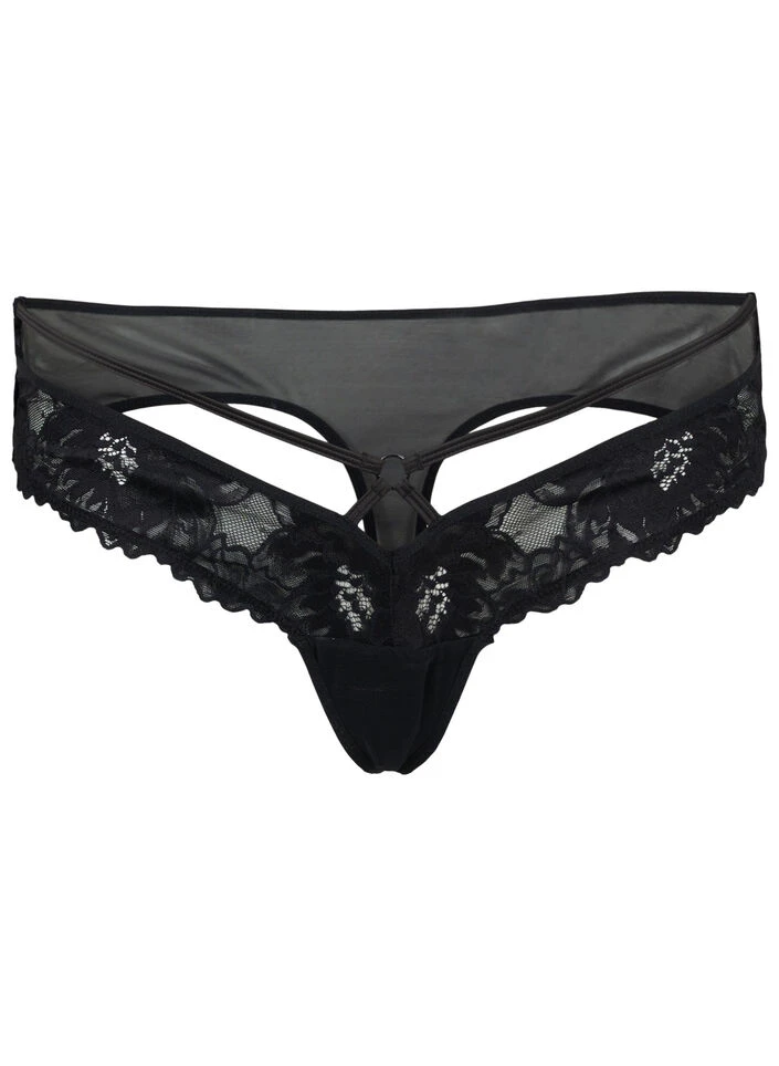 Lace thong with string details on the front and mesh on the back. The stocking has regular waist height.