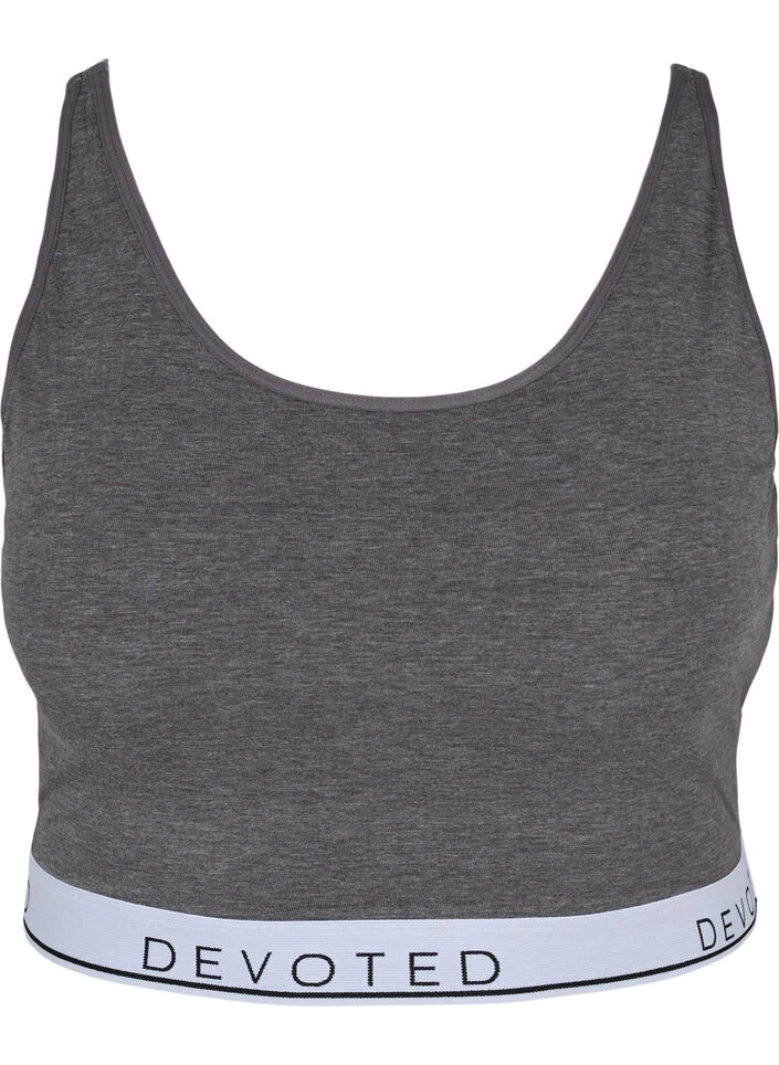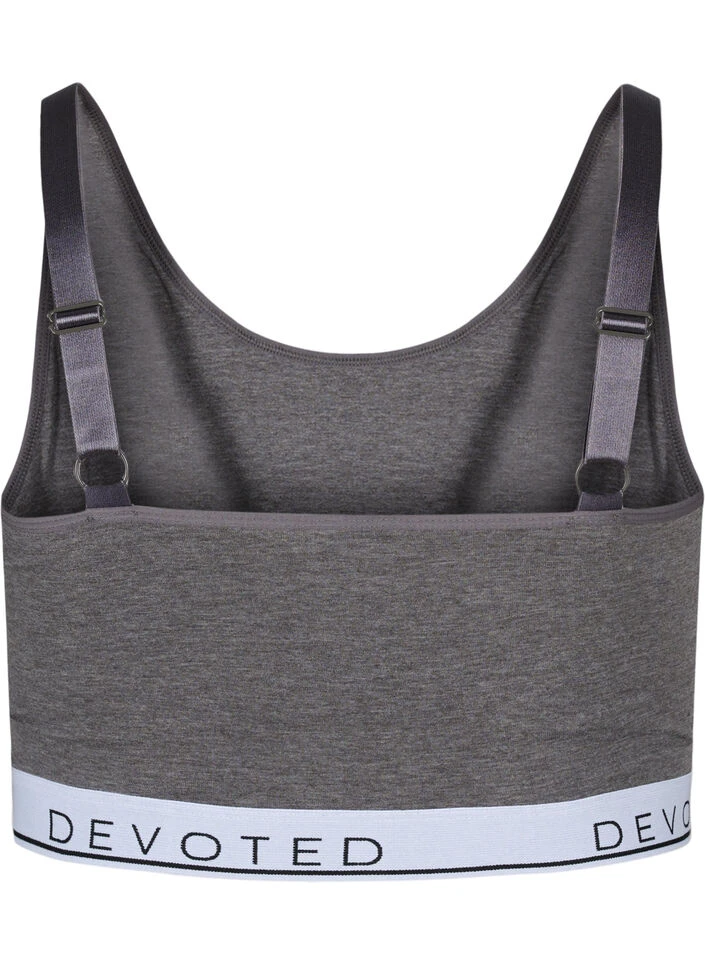 Super comfortable, wireless bra with a stylish marled look which has a round neckline and adjustable straps. The bra is made of a stretchy cotton blend and sits snug on the body for maximum comfort. It ends with an elasticated edge at the bottom with text details.