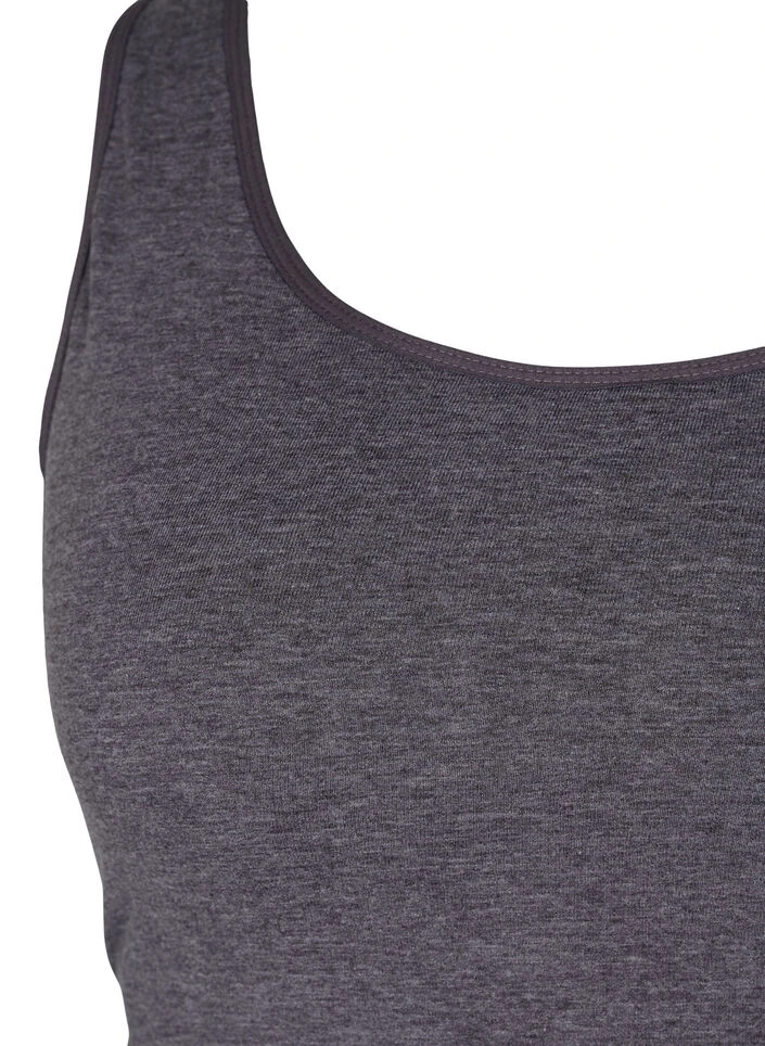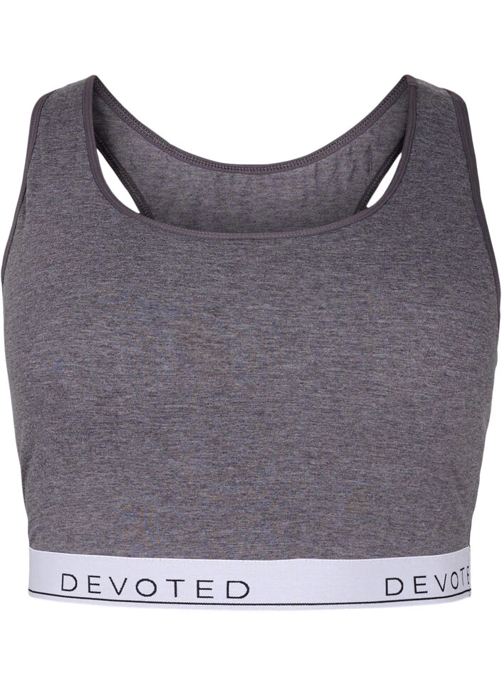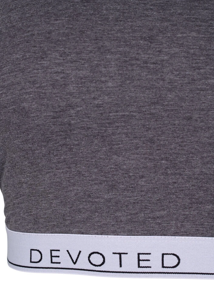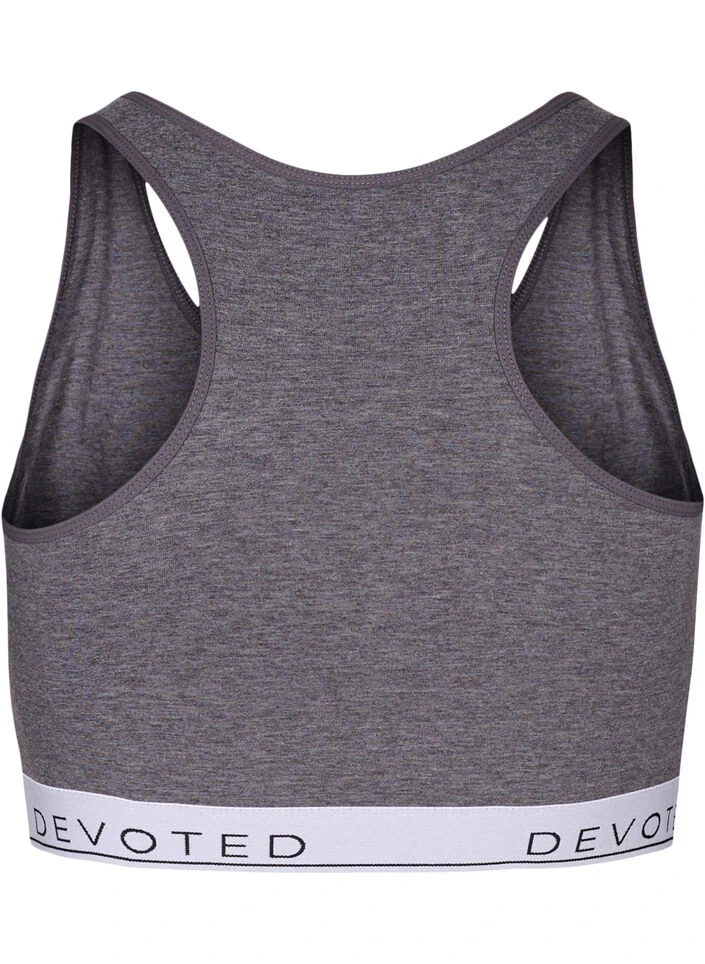 Incredibly comfortable wireless bra which has a round neckline and a stylish marled look. The bra is made of a stretchy fabric with cotton and sits snug on the body for maximum comfort. It ends at the bottom in an elasticated edge with decorative text print.