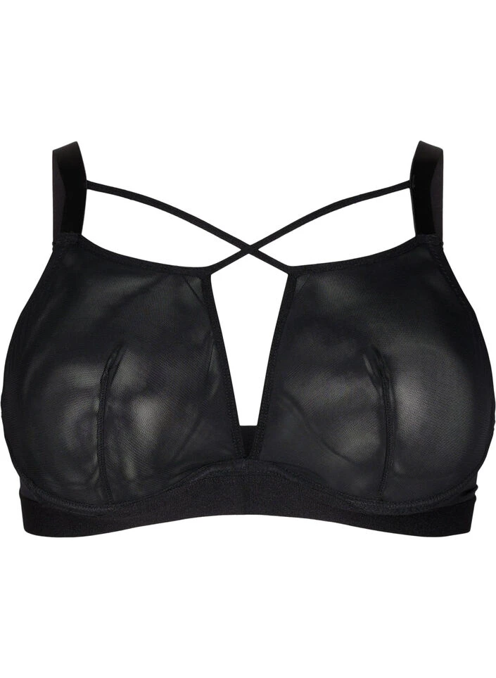 Nice bra in stretchable mesh quality with elastic string detail over the bust. It has adjustable shoulder straps, elastic under the bust and a low underwire, which provides support at the side and under the breast. It ends at the midsection and does not go up between the breasts like a classic underwired bra.