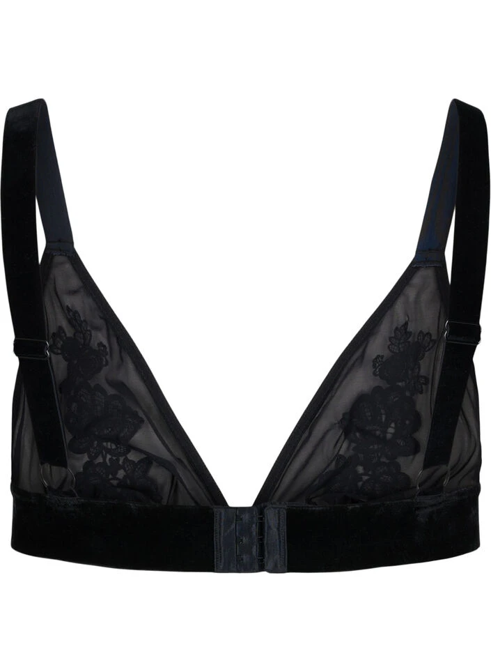 Gorgeous and elegant bra in mesh, which is embellished with stylish lace on the bust. The bra is non-wired and unpadded and has velour fabric on the adjustable straps and under the bust.