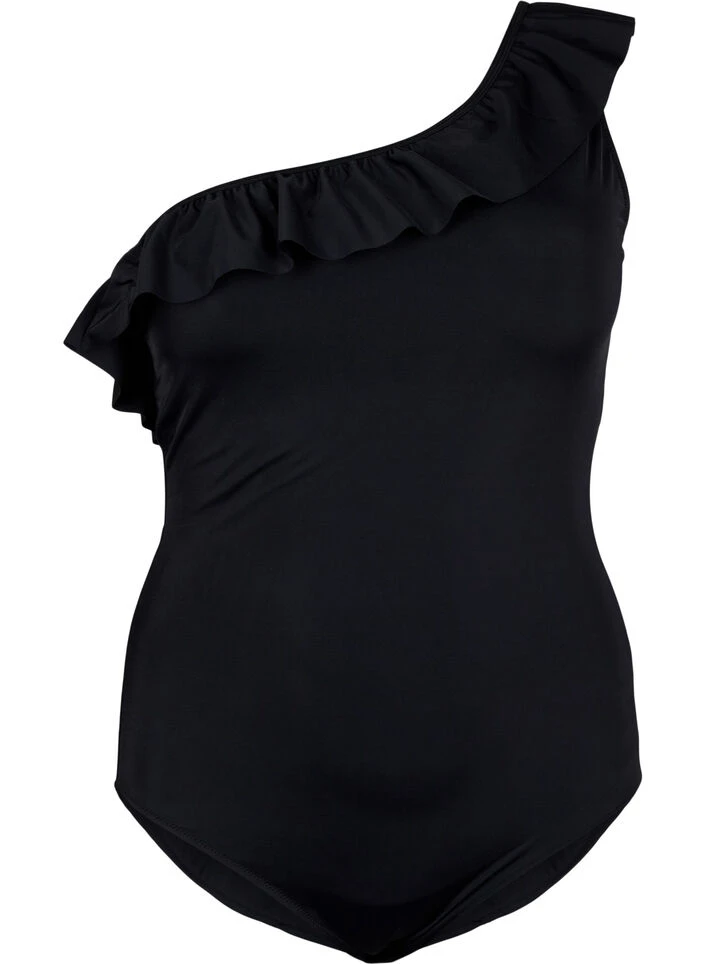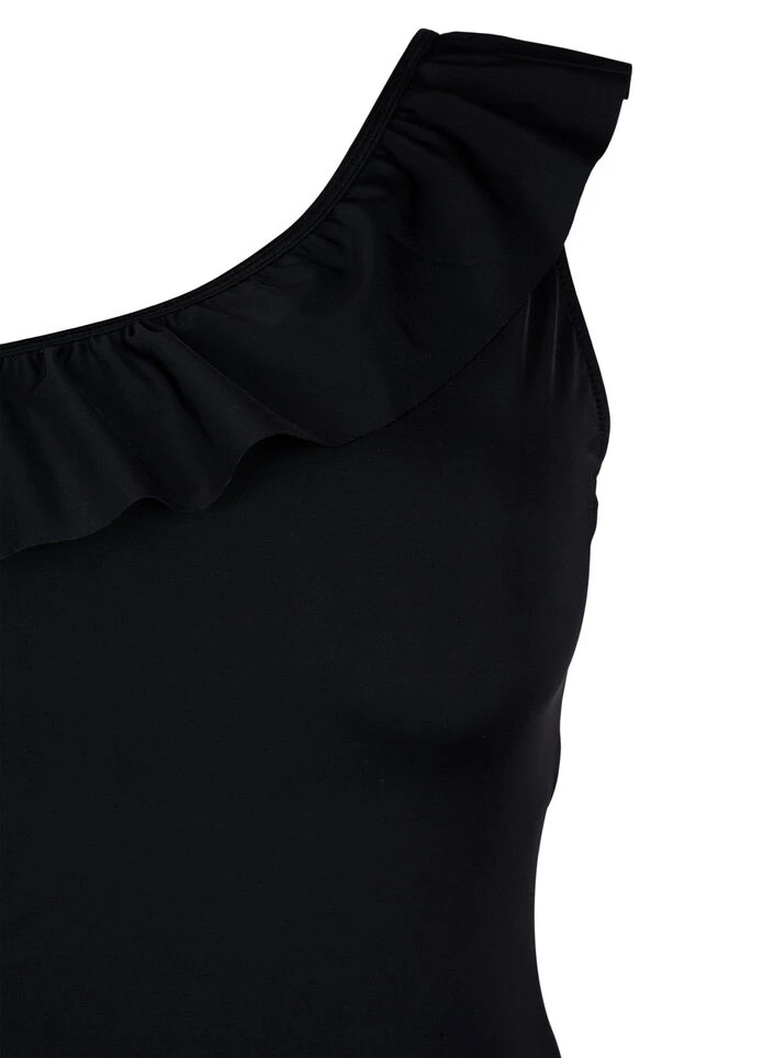 Feminine swimsuit made from a chlorine-resistant and durable material with a one-shoulder design and fine ruffle trim. This swimsuit has internal elastic under the chest and mesh lining on the front for extra support and comfort, ensuring a comfortable fit.