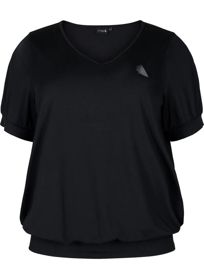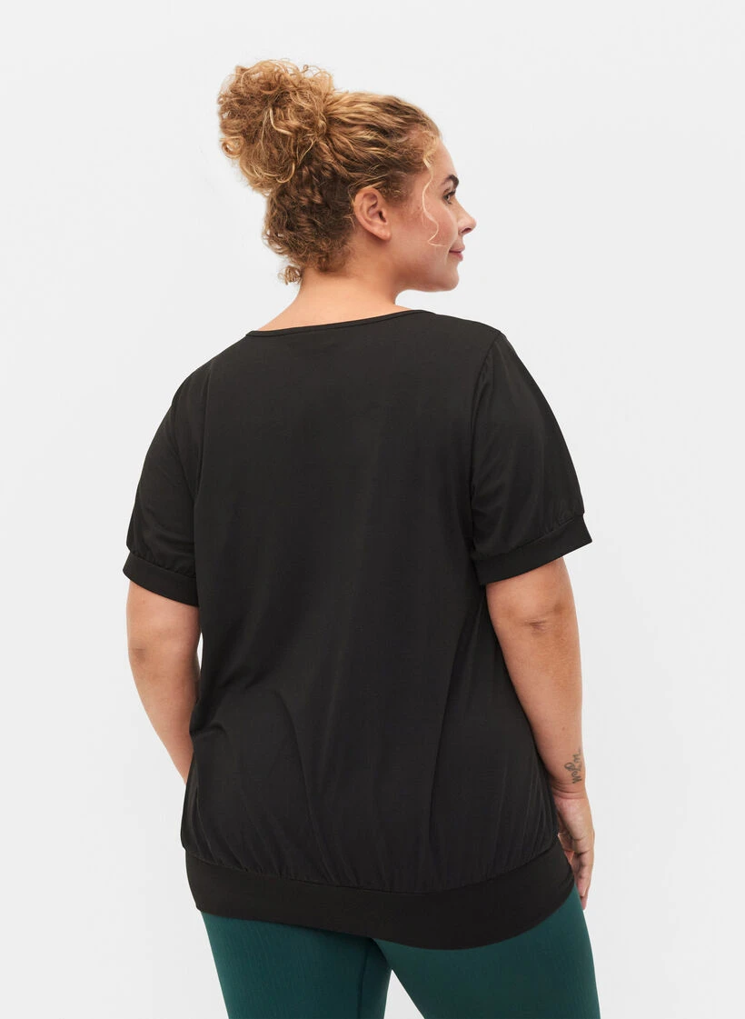 Comfortable workout t-shirt with loose fit, which ends with wide hem at the bottom. The t-shirt has short sleeves and v-neckline and is made in a stretchy fabric, which ensures a good freedom of movement.