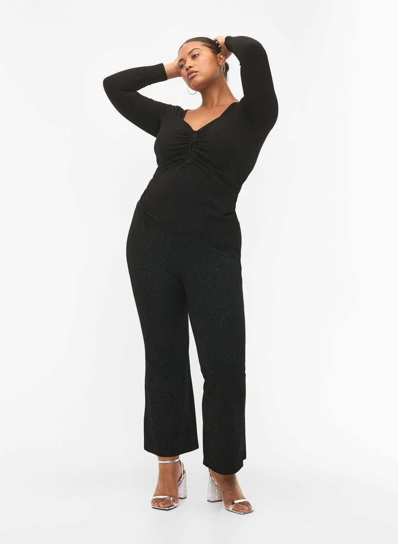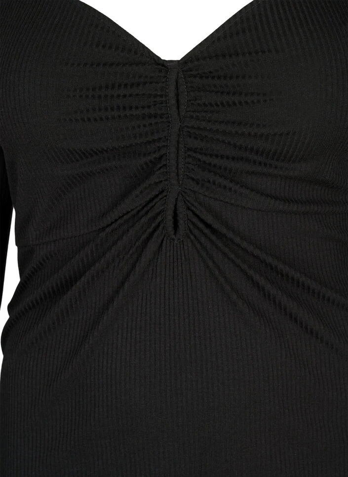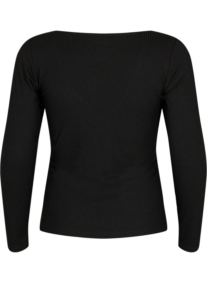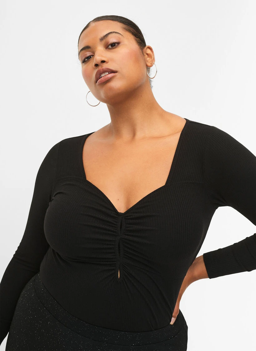 Long-sleeved blouse in a stretchy ribbed fabric with a tight fit. The blouse has a beautiful heart-shaped neckline and decorative hole detail with draping on the front, creating a trendy and sophisticated look.
