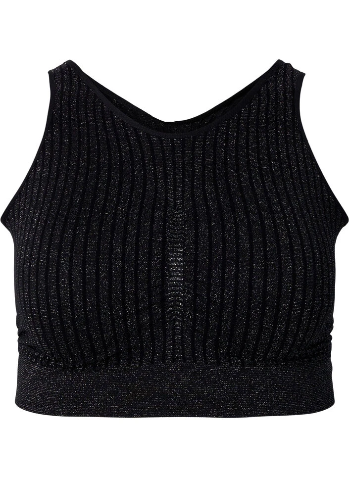 Seamless glitter bra with wide shoulder straps, a round neckline and elastic under the bust.