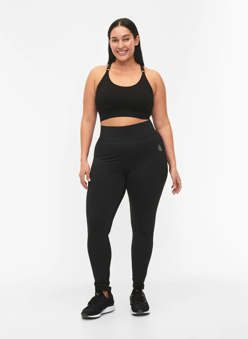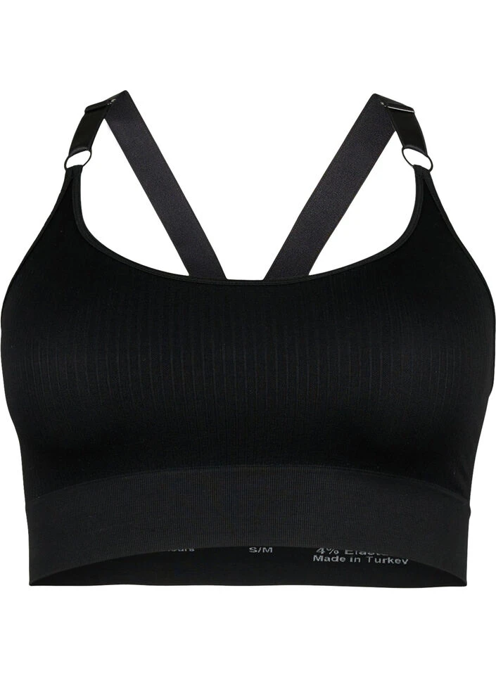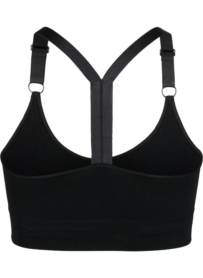 Seamless sports bra in ribbed material with wide edge under the bust. The sports bra has adjustable straps that gather in the middle of the back.
