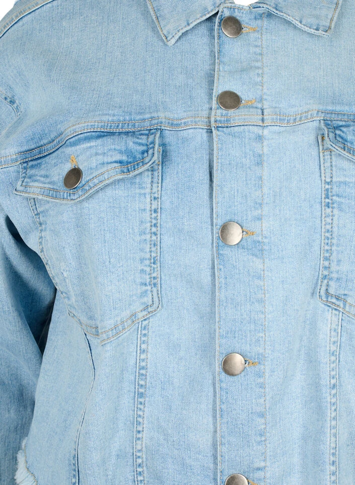 Cool denim jacket with distressed details and a raw edge at the bottom. The jacket has button closure and chest pockets and is made of a stretchy cotton quality with a loose fit.