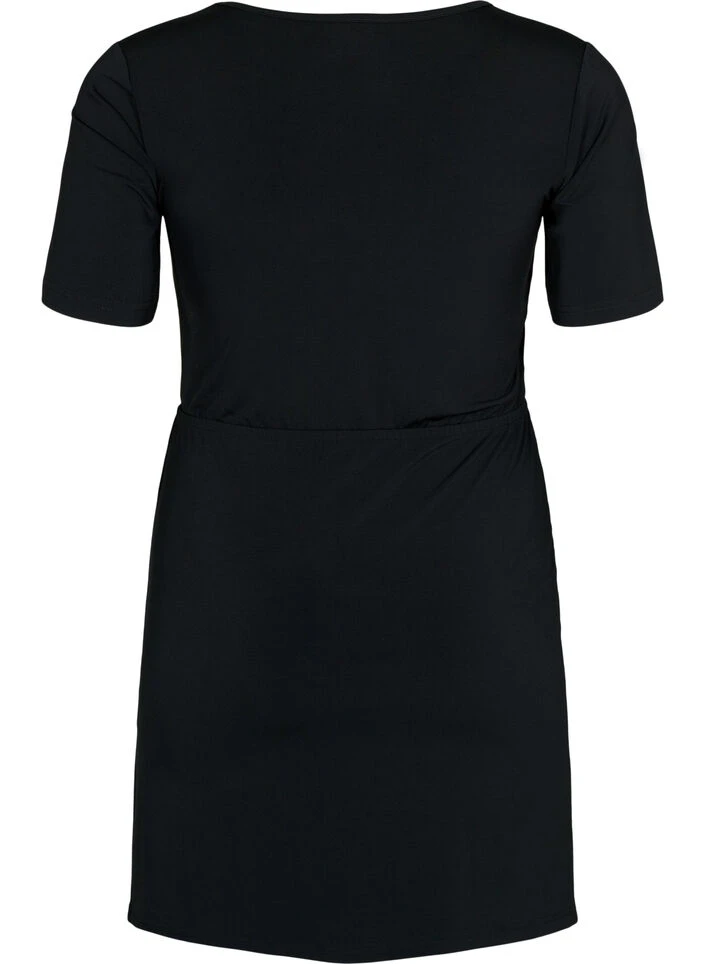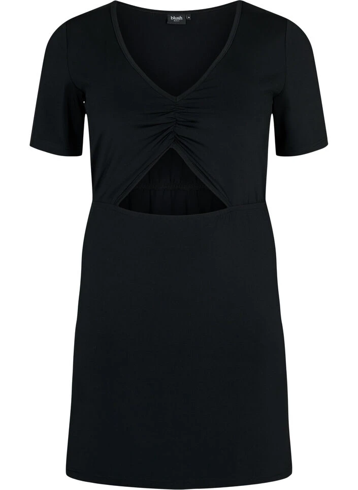 Trendy short dress with a cut-out section at the front, short sleeves and a v-neck with gathers. It has a close-fit with a narrow elasticated waistband.