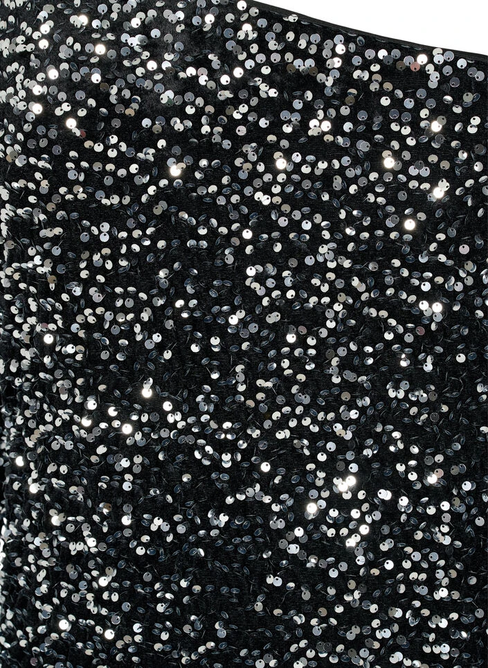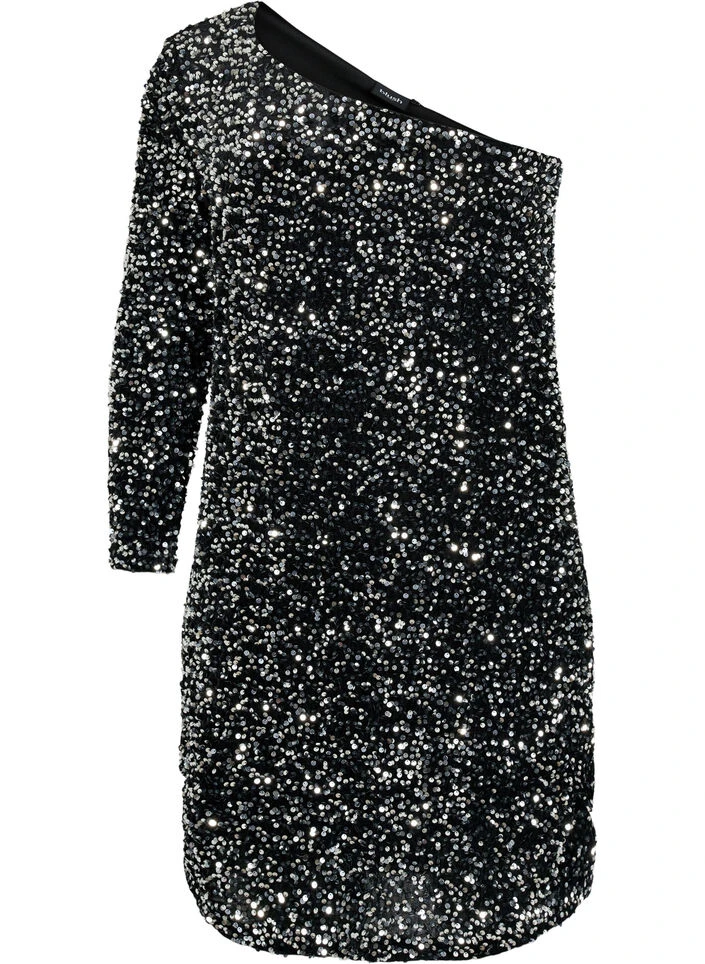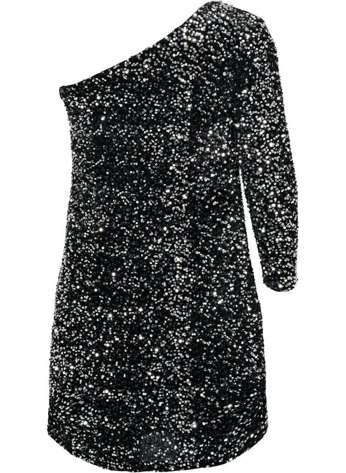 Short dress with a trendy one-shoulder design and a tight fit. The dress is decorated with beautiful sequins for a radiant and festive effect.