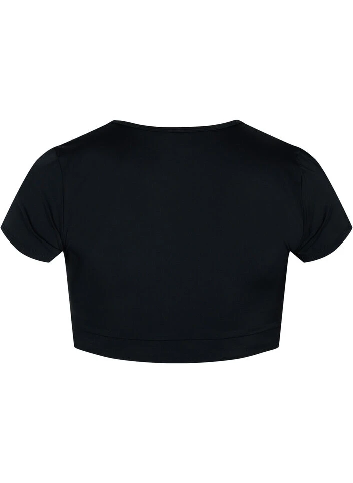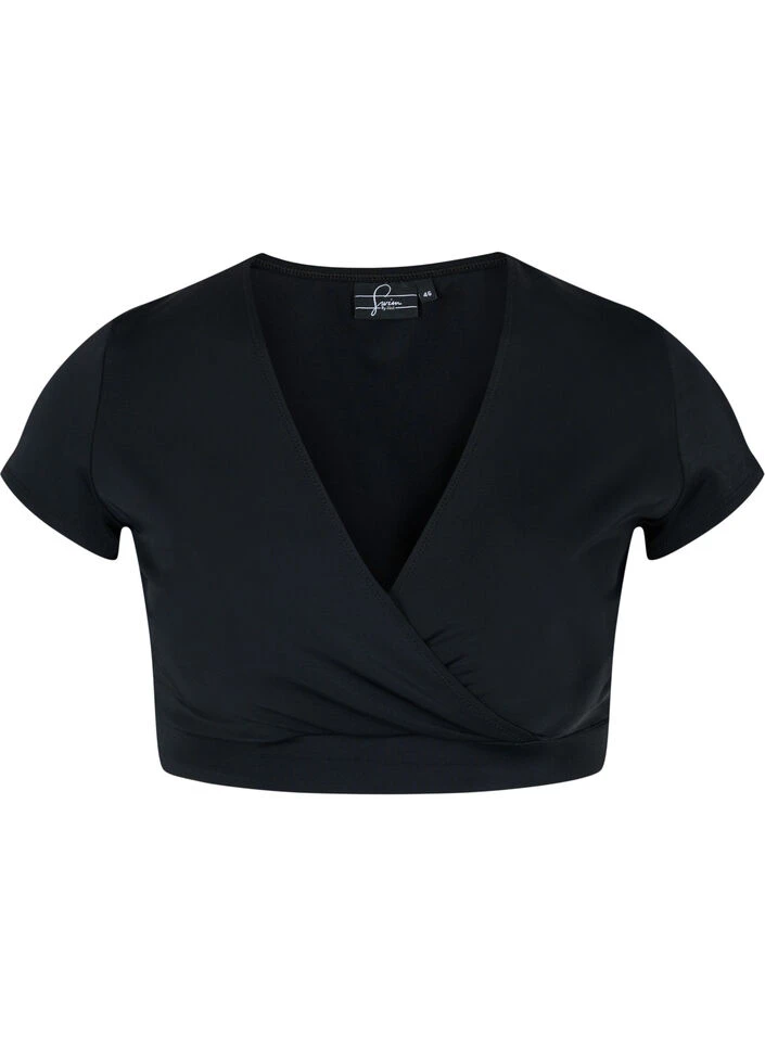 Swim top with short sleeves and a nice v-neckline with wrap. The top is sewn with double lined fabric, which wraps nicely around your shape and provides good comfort and support.