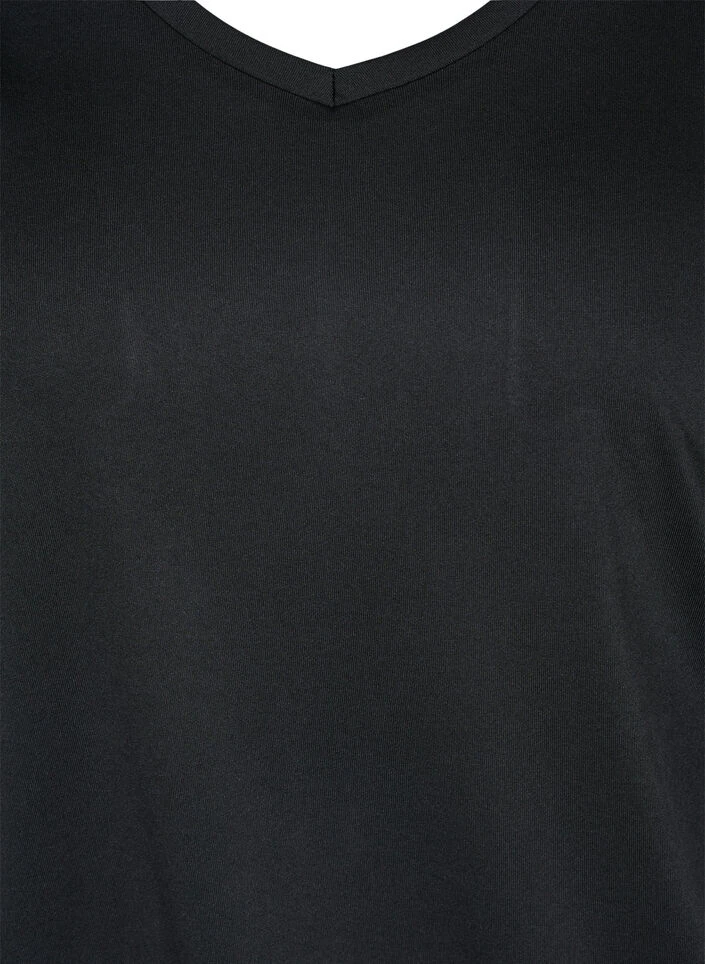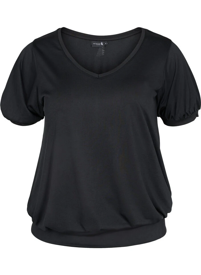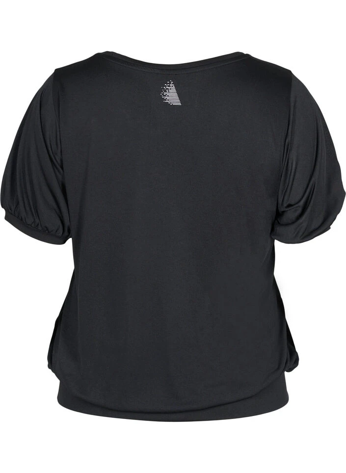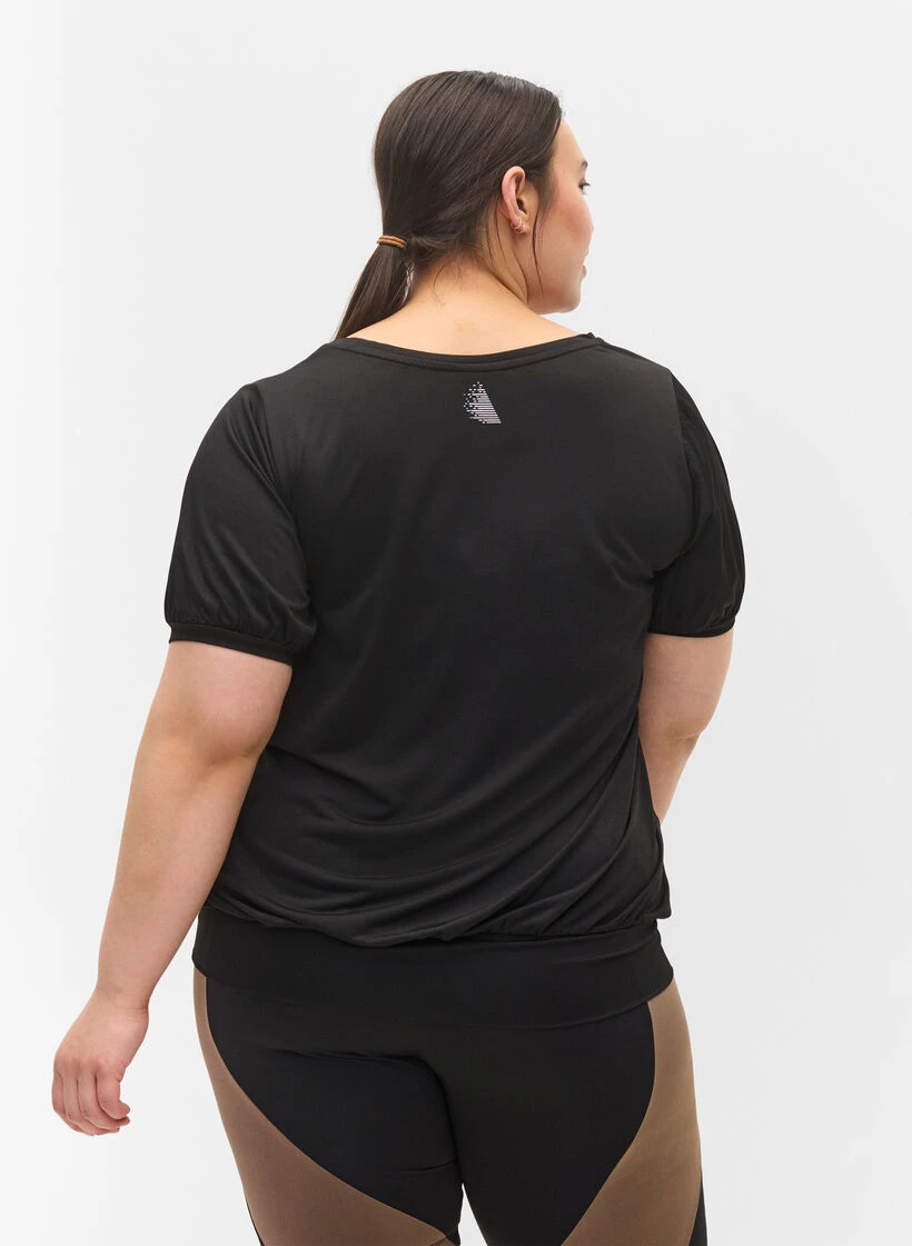 Solid-coloured exercise top with short sleeves and a rounded neckline. The top has a loose fit and ends with a wide elasticated hem at the bottom.