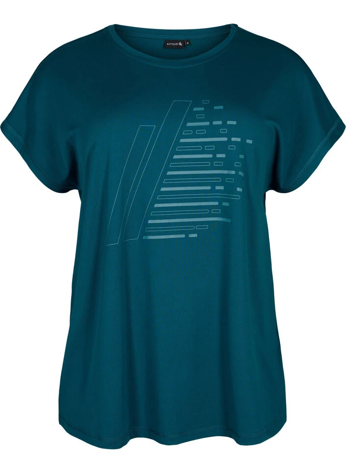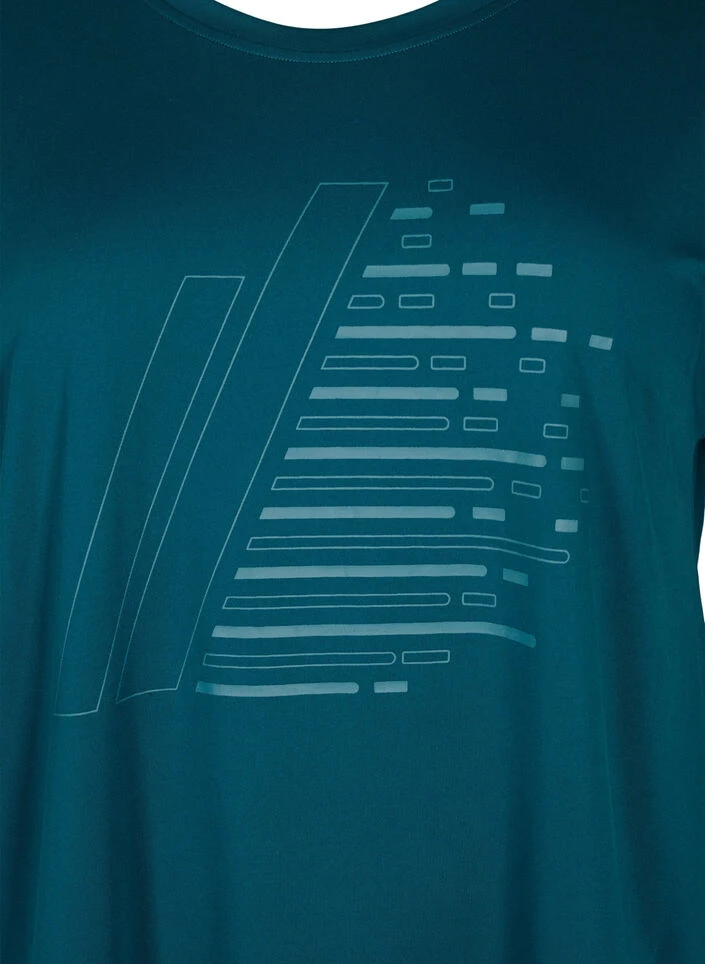Short sleeve workout t-shirt with a round neckline and sporty print on the front.