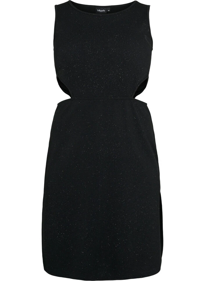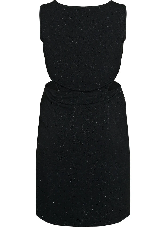Sleeveless dress in stretchy material with glitter. The dress is short with a side slit and has trendy details with cut-out detailing on the sides.
