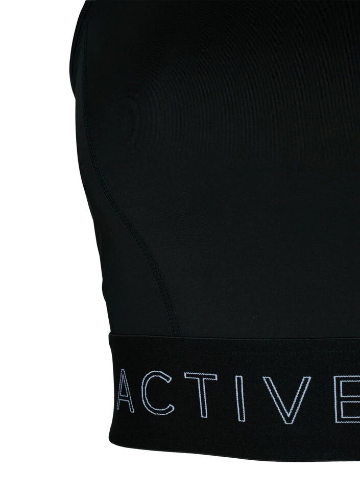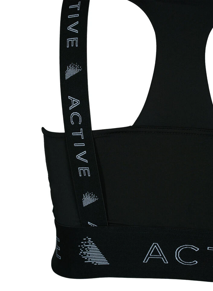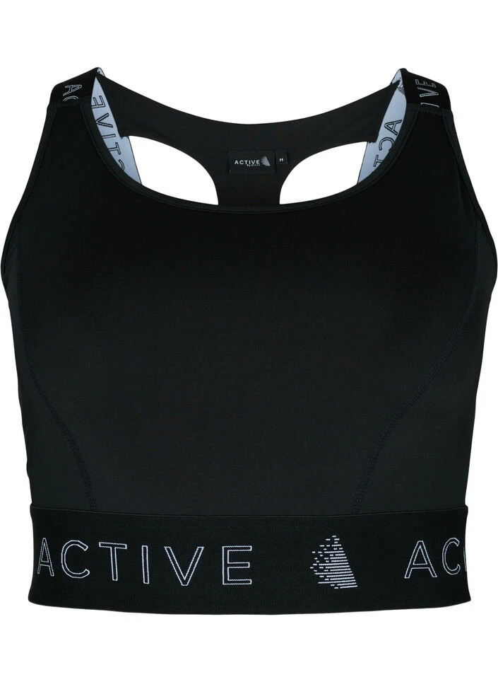 Cool sports bra with racer back and sporty text print at shoulder straps and under chest.