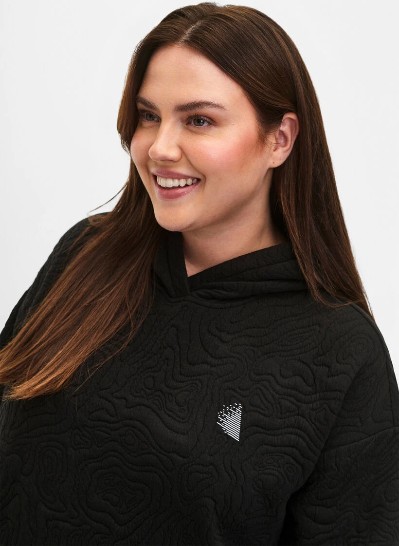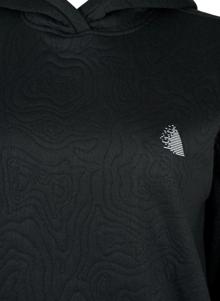 This hooded sweatshirt is designed with a nice structure in the fabric. The sweatshirt has long sleeves with elastic closure and drawstring with adjustable cords at the bottom, allowing you to customize the fit.