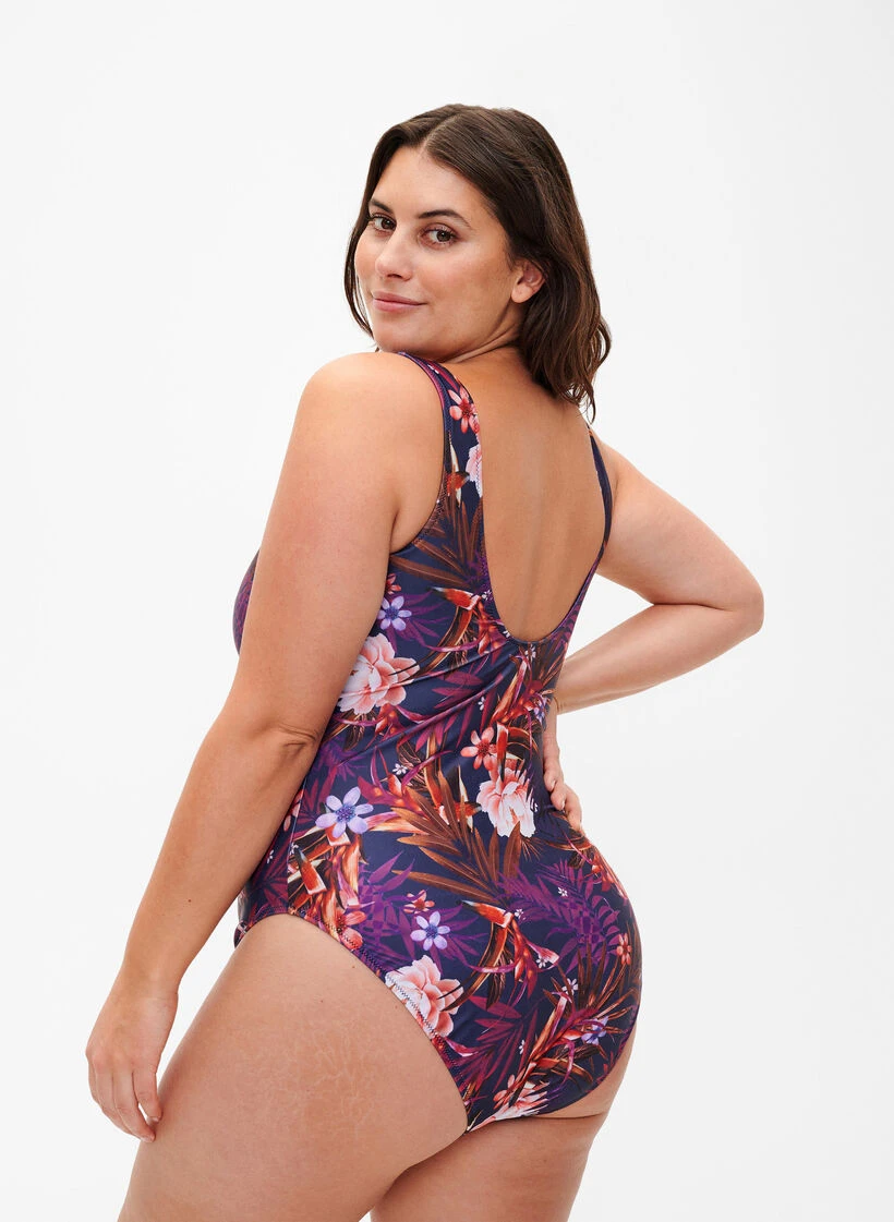 Swimsuit with a square neckline, wide shoulder straps and a high leg cut. The swimsuit has a nice all-over print and mesh lining at the front that fits tightly around the body for extra support and comfort.