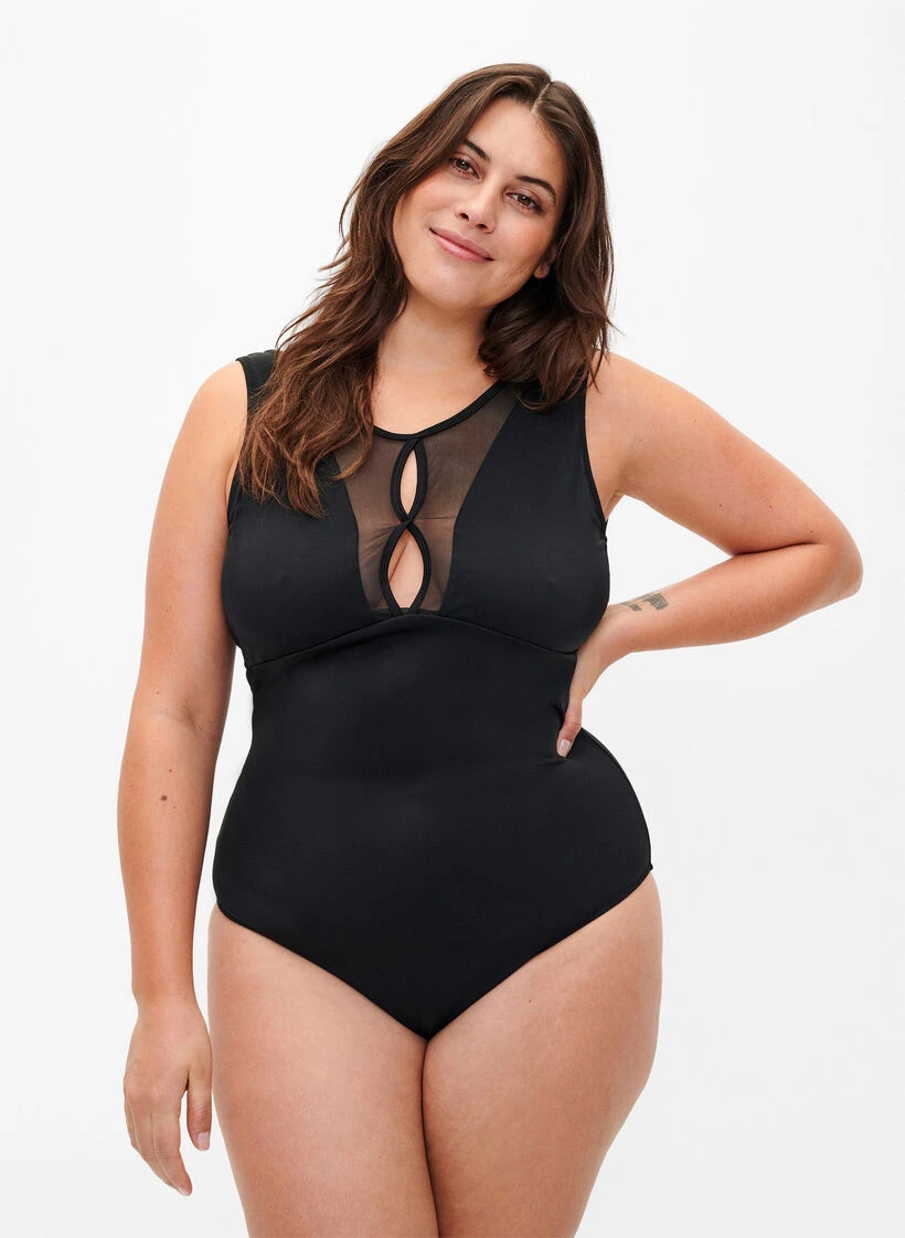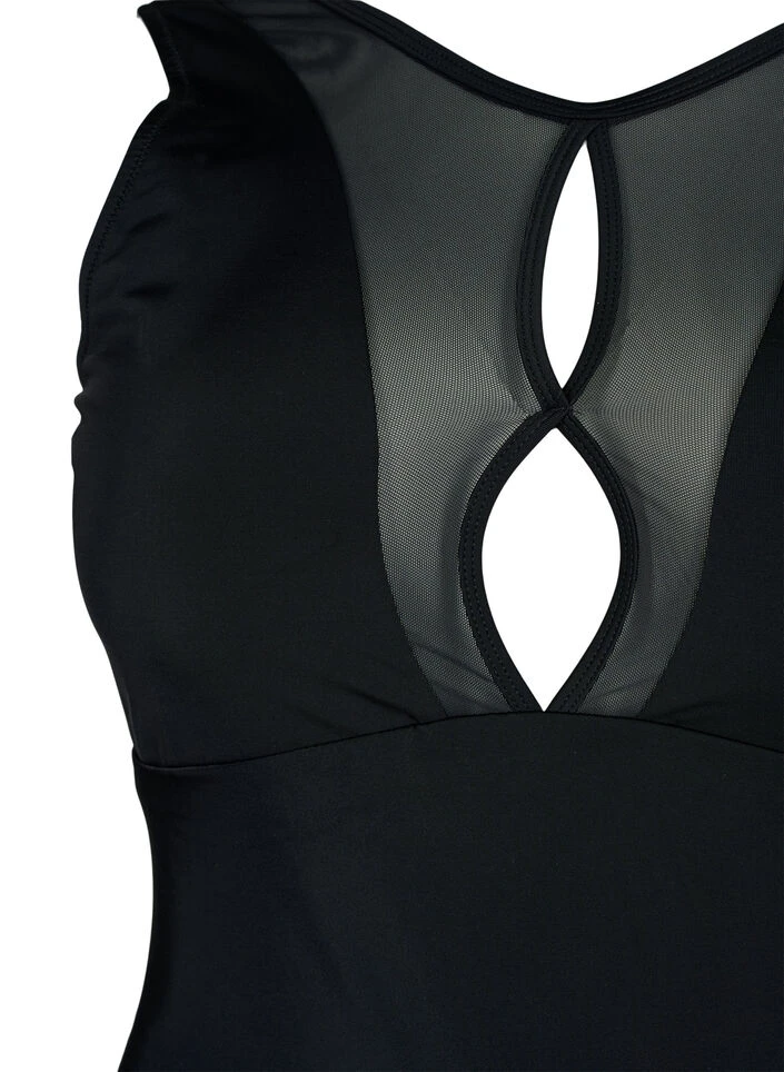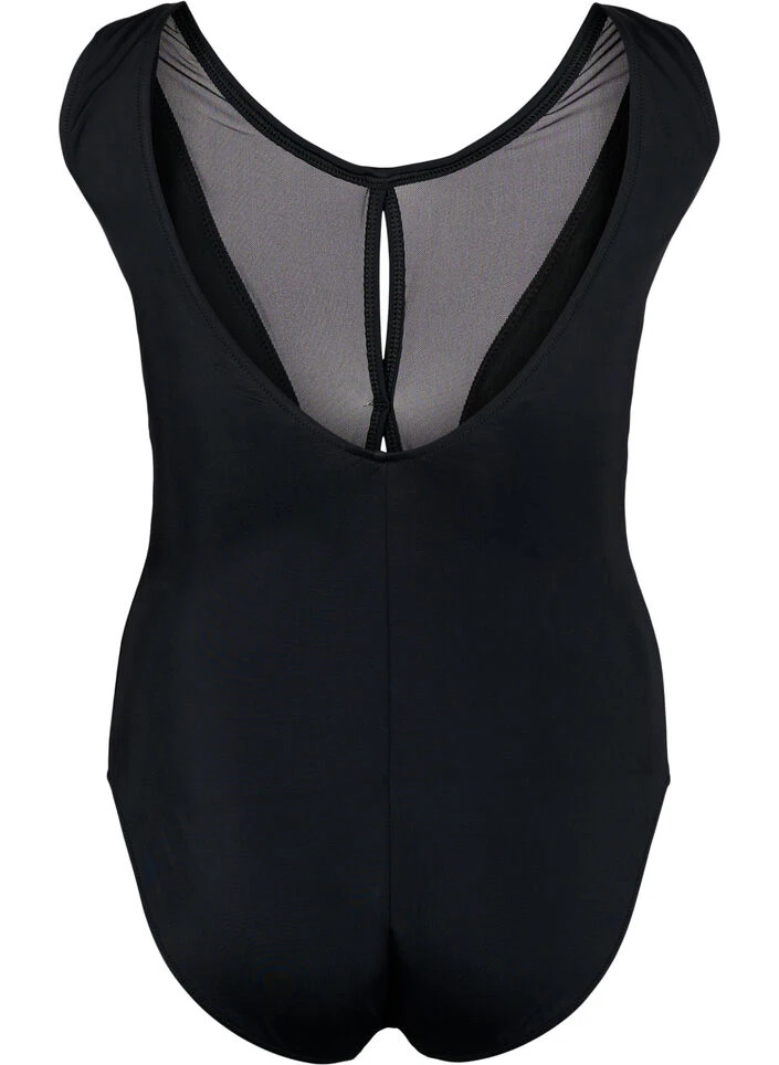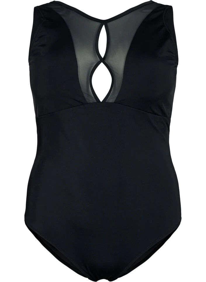 Swimsuit with beautiful mesh detailing at the chest and a plunging back neckline. The swimsuit has elastics under the chest and mesh lining on the front for support and comfort.