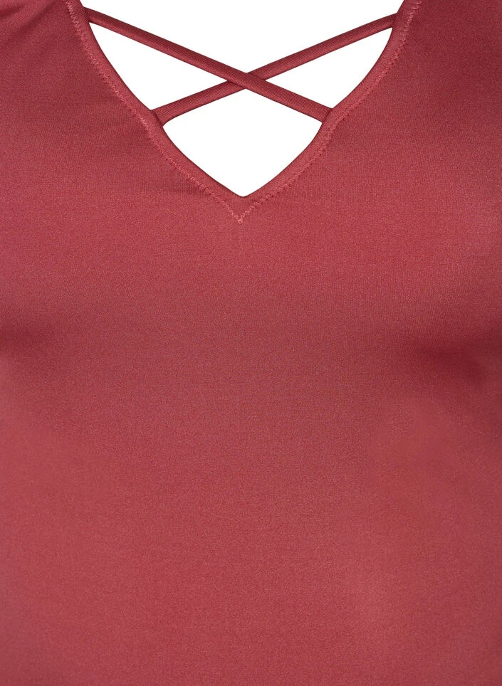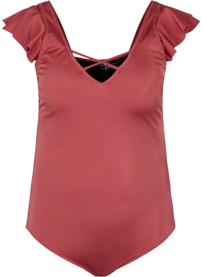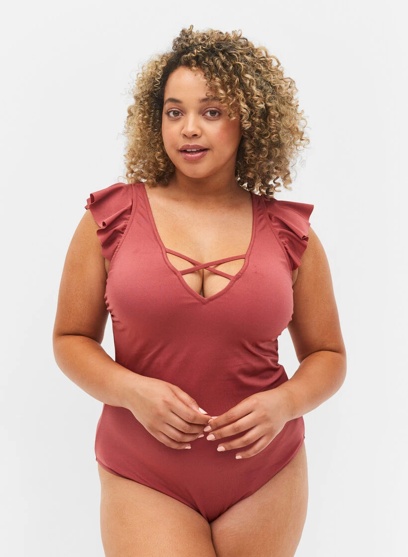 Feminine swimsuit with ruffle sleeves and v-neckline with decorative string details. The swimsuit is made of a 2-layer fabric that hugs your shape and provides good support and comfort.