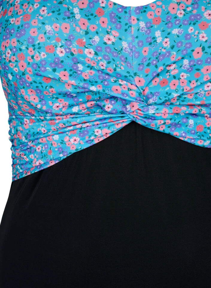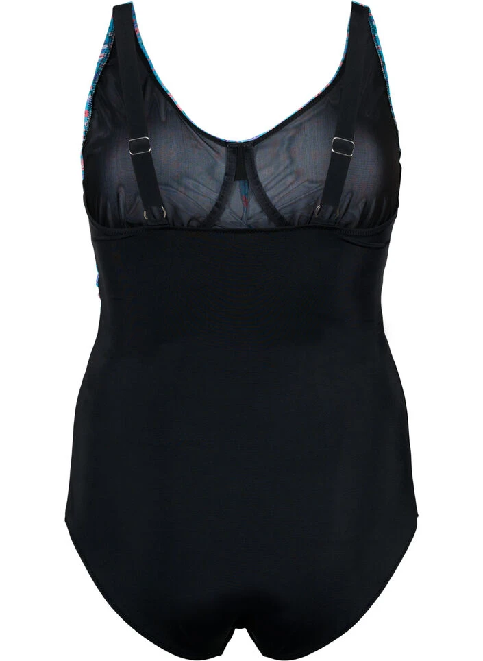 Feminine swimsuit with underwire and adjustable straps. It is sewn in quick-drying and durable 2-layer fabric, which provides better support. The swimsuit has nice print details on the bodice, which create a nice contrast against the black design.