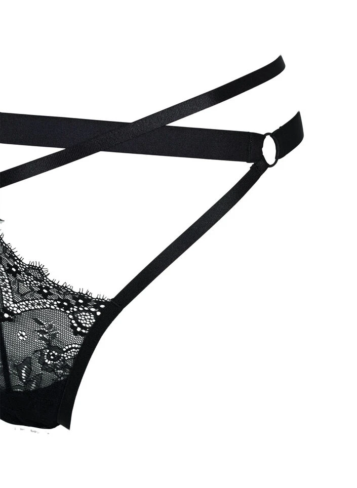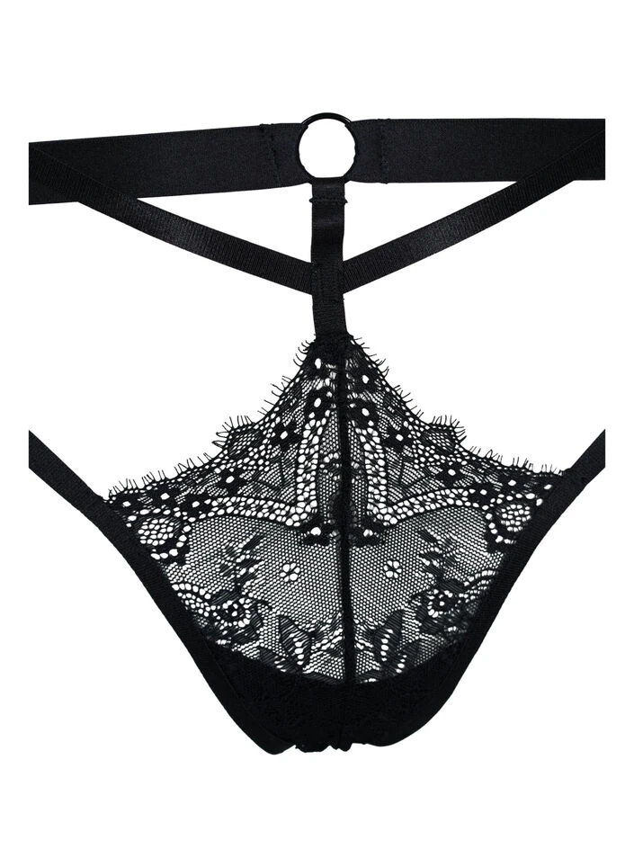Lace thong with regular waist, in a challenging and revealing design with string details.
