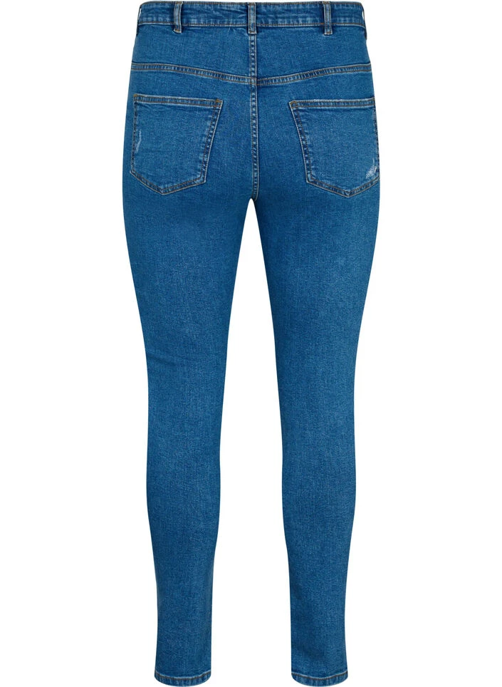 Tight-fitting jeans with raw wear details and holes on the knees for a cool look. They have a high waist, classic pockets and belt loops.